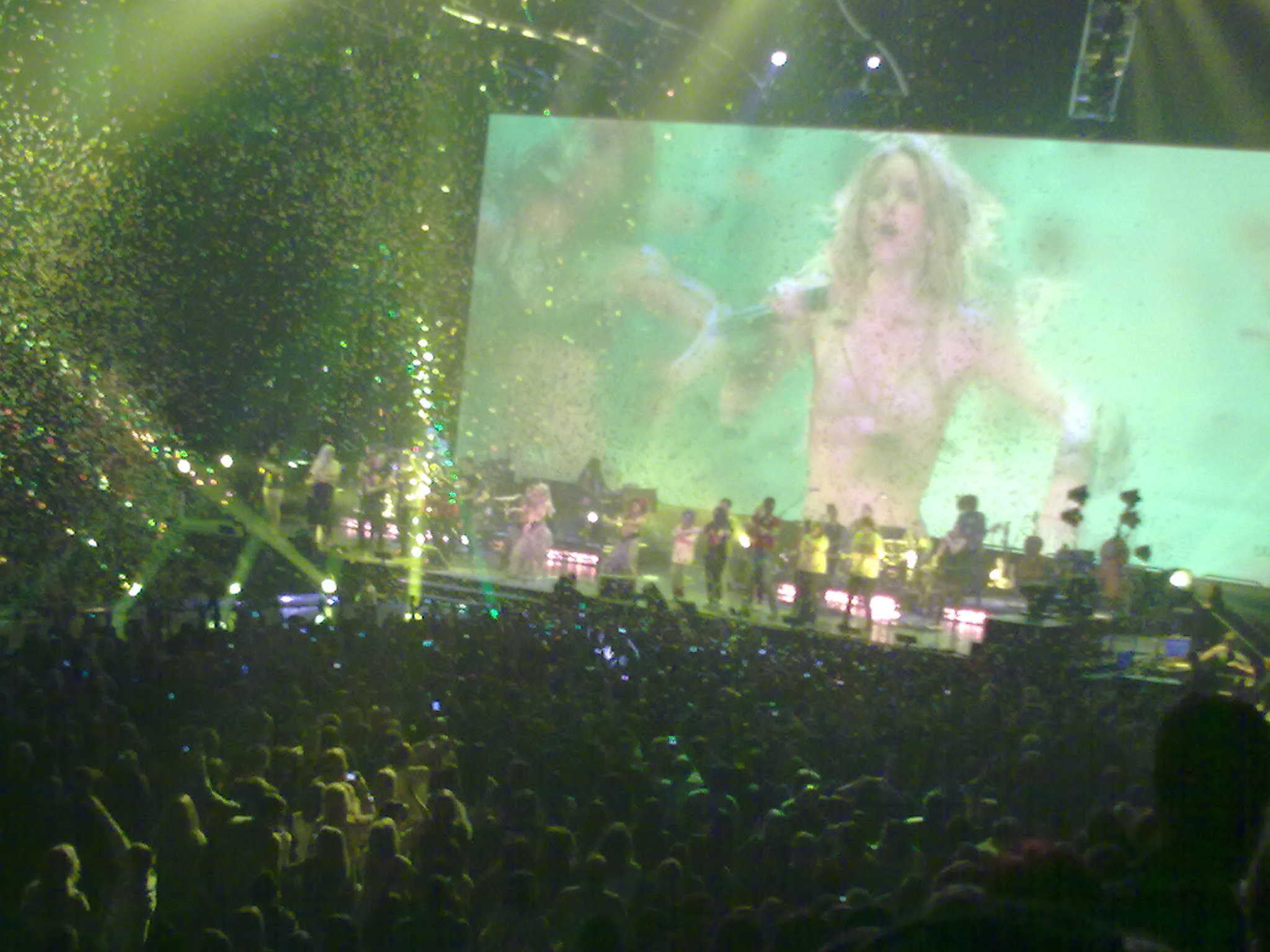 샤키라가 잉글랜드 맨체스터에서 열린 콘서트 쇼에서 "Waka Waka (This Time for Africa)"를 공연하고 있다.
