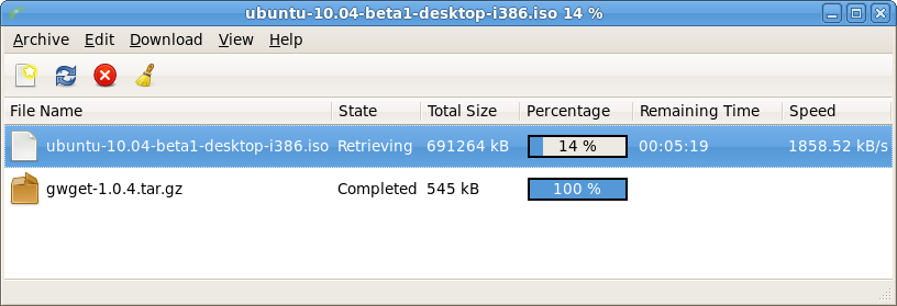 GNOME을 사용하는 페도라에서 사용가능한 Wget의 자유 소프트웨어 그래픽 사용자 인터페이스인 GWget의 스크린샷은 다음과 같다.