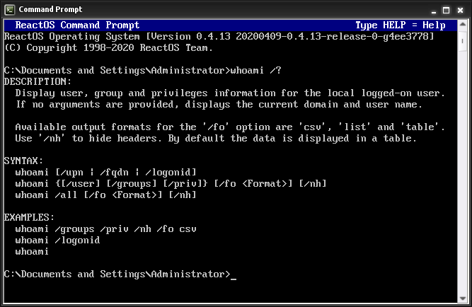 윈도우 및 ReactOS 환경의 명령 프롬프트에서 `whoami` 명령어를 사용하면 현재 로그인한 사용자의 사용자 이름과 속한 작업 그룹 또는 도메인 이름을 확인할 수 있다.일반 사용자 계정(`admin`)으로 로그인했을 때의 예시는 다음과 같다.