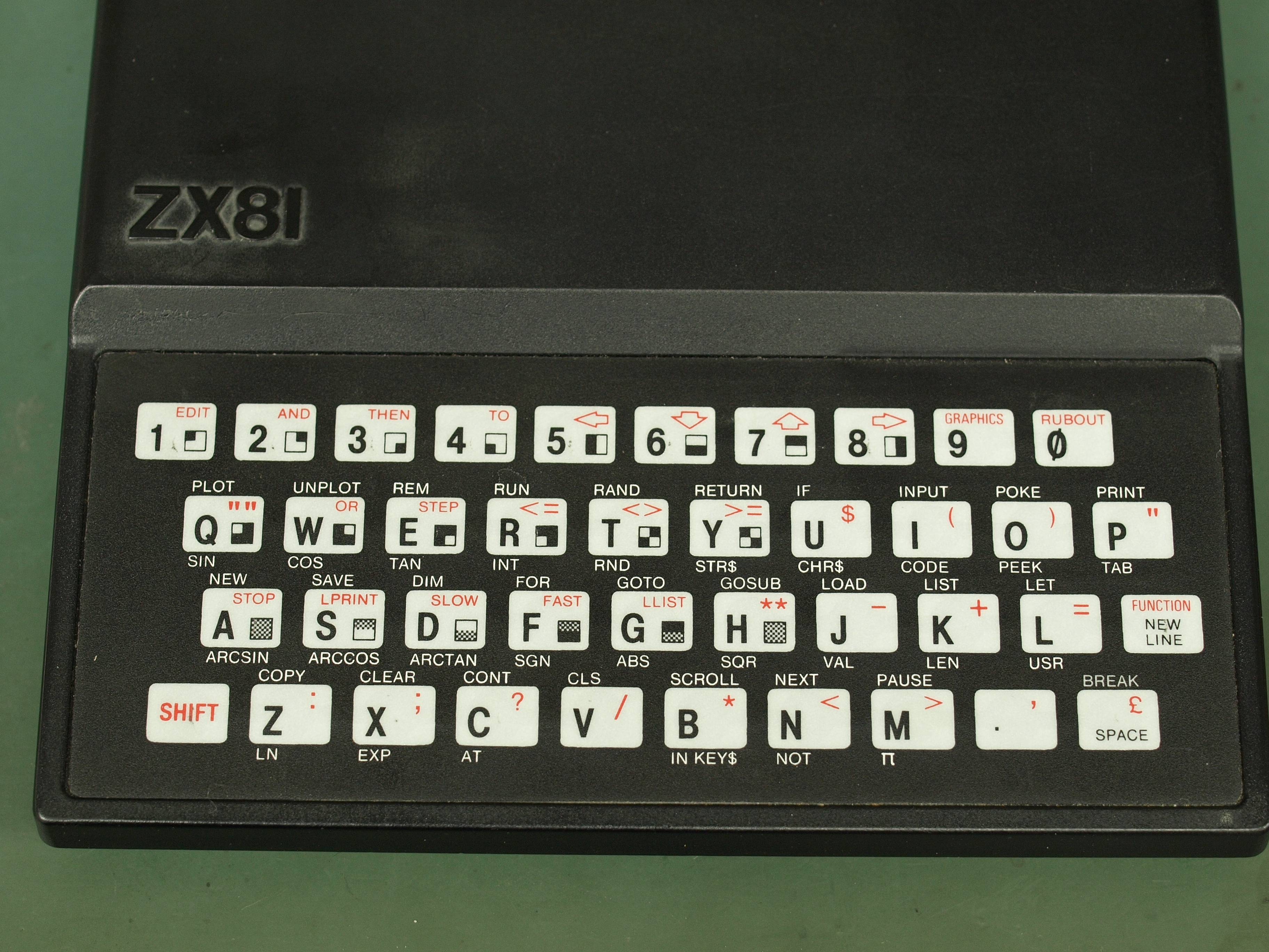 ZX81 키의 기능은 명령 컨텍스트 및 모드 선택의 조합에 의해 결정되었다. 예를 들어, 빨간색 키보드 기능을 선택하려면 `SHIFT` 및 `FUNCTION` 키를 사용했다. P 키는 문자 `P`, `"` 문자 및 BASIC 명령어 `PRINT` 및 `TAB`을 결합했다.