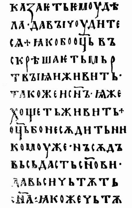 이러한 형태 변화에 대한 한 가지 설명은 А, Б, В, Є, Ж, З, Н, К, Х, Ч, Э, Ю와 같은 문자들을 가로지르는 가상의 선을 기준으로 정렬하려는 경향 때문일 수 있다는 것이다. 예를 들어, 필사자가 H 형태의 문자 И의 가로선을 중간보다 높게 그리면, 다른 유사한 문자들도 그 가상의 선에 맞춰 그려지면서 N 형태의 문자 Н의 대각선 길이도 짧아져 가상의 선 수준에서 끝나도록 조정되었을 수 있다. 이후 다른 필사자들이 이러한 수정을 반복하면서 원래의 이유는 점차 잊혔을 가능성이 있다. 웅변체 그리스어에서도 H(에타)의 가로선 위치가 변하는 경우가 있으며, N(뉴)의 형태는 그대로이거나 이에 따라 변형되기도 하고, 때로는 동일한 텍스트 안에서 두 가지 버전이 함께 나타나기도 한다(강독집 5, 강독집 183 참조).