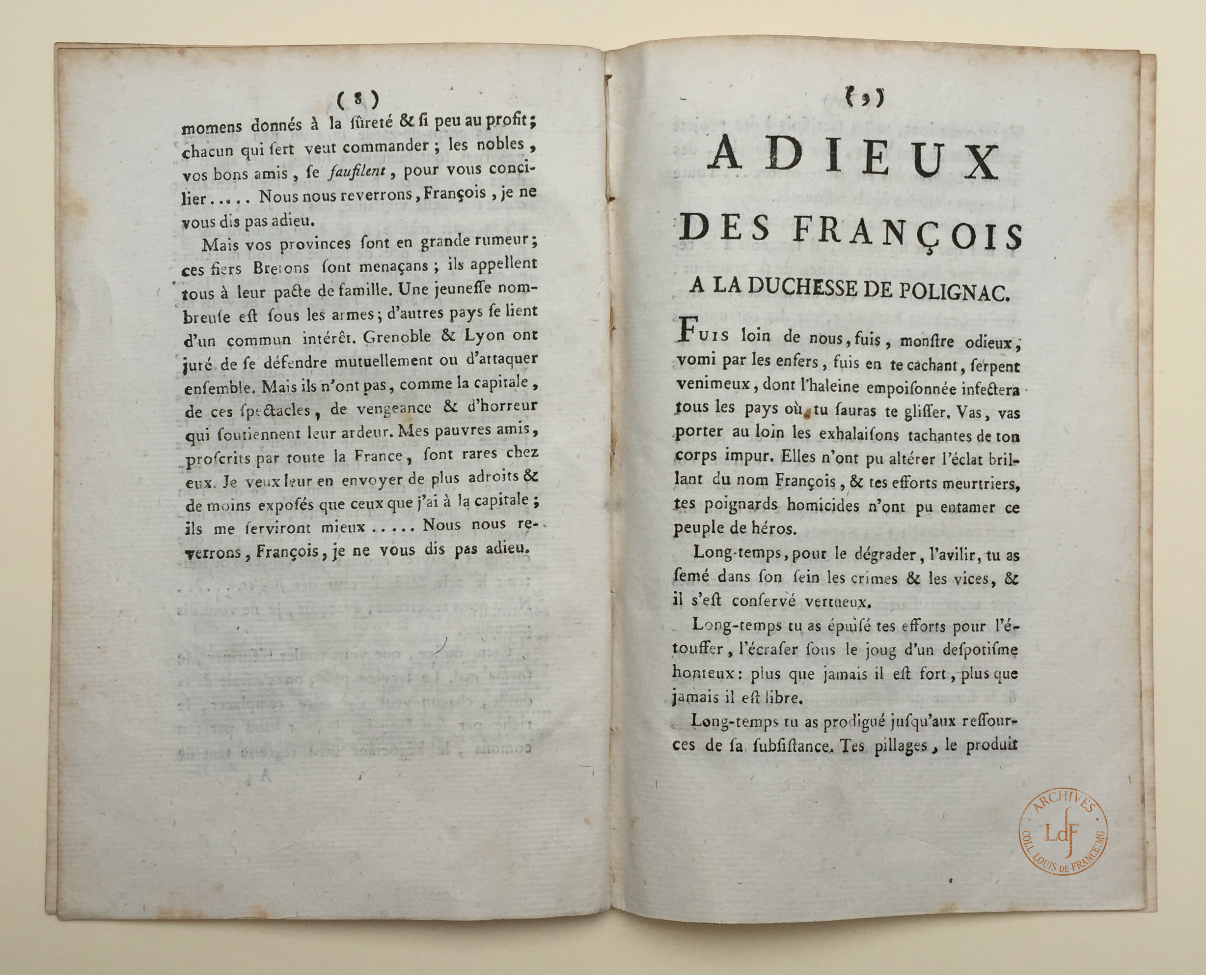 > "맹트농 부인이나 퐁파두르 부인조차도 천사 같은 눈빛의 총애, 얌전하고 온순한 폴리냑만큼 돈을 쓰게 하지는 않았다. [폴리냑 가문에 대한 총애라는] 이 소용돌이에 휘말리지 않은 사람들은, 멍하니 서 있을 뿐... [왕비의] 손을 보이지 않는 곳에서 조종하고 있는 것은, 보라색 눈을 가진 여자, 아름답고, 조용한 폴리냑 부인이었다."[24][64]