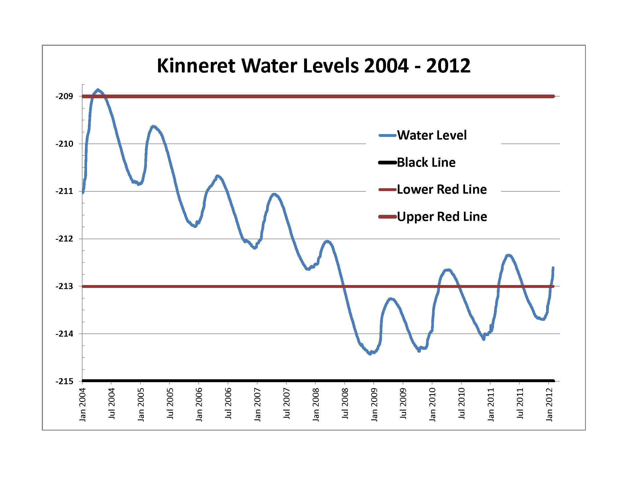 갈릴래아 호수의 수위는 1969년부터 매일 모니터링되고 있으며, 그 이후로 기록된 최저 수위는 2001년 11월로, 현재 해수면 아래 214.87m의 "검은 선"을 구성한다. 이스라엘 정부는 수위를 모니터링하고 그 결과를 매일 발표한다.[37] 이스라엘, 레바논, 요르단에서 증가하는 물 수요와 건조한 겨울로 인해 호수에 스트레스가 가해지고 수위가 위험할 정도로 낮아졌다. 갈릴래아 호수는 호수 아래의 염수 샘에 의해 돌이킬 수 없게 염분화될 위험이 있으며, 이는 호수 위의 담수의 무게에 의해 억제된다.[38]