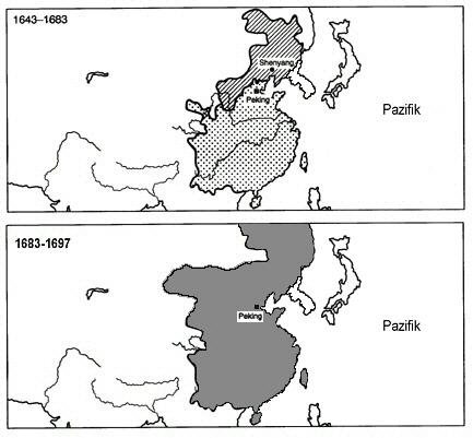 1683년, 정씨 왕조(鄭氏王朝)의 동닝 왕국(東寧王國) 해군은 청나라 제독 시랑이 이끄는 함대에 펑후 해전(澎湖海戰)에서 패배했다. 정성공의 손자 정계상(鄭克爽)이 항복하여 타이완은 청나라의 일부가 되었다. 정계상은 "해성공"(海澄公) 작위를 받고 팔기군(八旗軍)에 편입되었다. 그의 군인들도 팔기군에 편입되어 알바진 전투(알바진 전투)에서 러시아 코사크와 싸웠다.