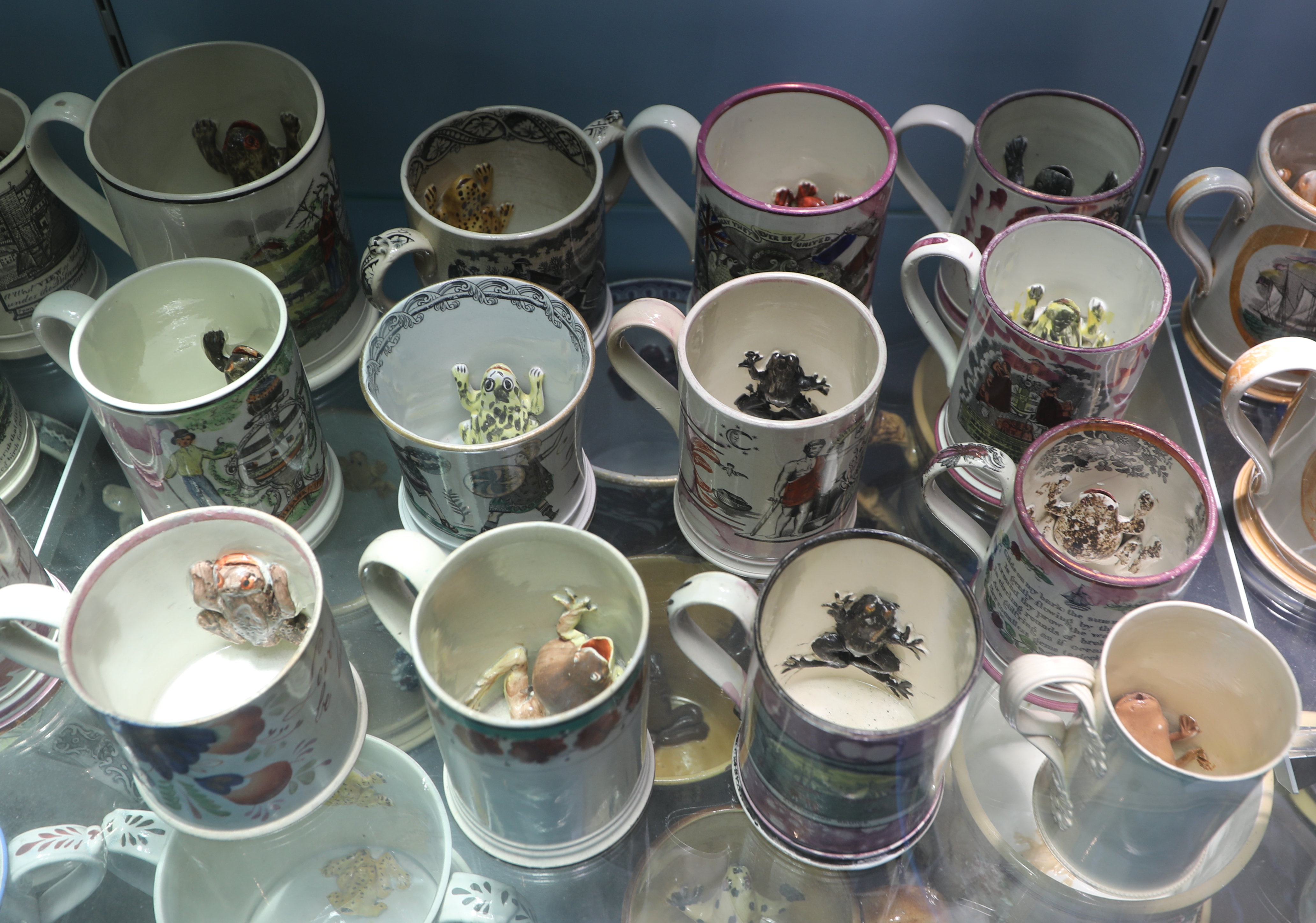 개구리 머그잔은 1775년경부터 시작되어 19세기 말까지 인기를 얻었다. 순진한 술꾼은 맥주를 마시다가, 음료가 비워질 때쯤 흐린 액체 속에서 나오는 개구리를 보고 놀랐을 것이다. 어떤 경우에는 머그잔을 기울이면 개구리가 입의 구멍을 통해 술꾼에게 웅얼거리고 침을 뱉기도 했다. 일부 머그잔에는 두 개[26] 또는 세 개의 손잡이가 달려있고 여러 마리의 개구리가 들어있기도 했다.[27] 이러한 머그잔은 선원들이 자주 드나드는 술집에서 흔히 사용되었기 때문에 해군 관련 언급이 많다.[7]