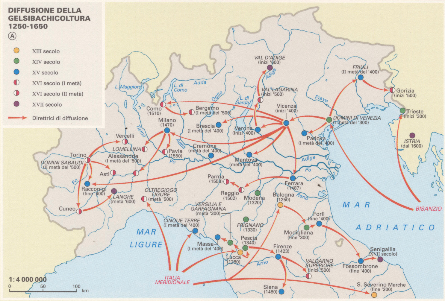 11세기와 12세기에 이탈리아 도시 국가 루카의 비단 산업이 갑작스럽게 호황을 누린 것은 시칠리아인, 유대인, 그리스인 정착민들과 더불어 남부 이탈리아 도시들에서 온 이주민들의 영향이 컸다.[41] 레반트 지역의 여러 이탈리아 교역소를 잃으면서 중국풍 비단 수입이 급격히 줄어들자, 고급 직물에 대한 부유하고 강력한 부르주아 계층의 수요를 만족시키기 위해 루카, 제노바, 베네치아, 피렌체 등의 도시들은 비단 생산을 크게 늘렸다. 이들 도시는 곧 유럽 전역에 비단을 수출하게 되었으며, 1472년 피렌체에는 최소 84개의 작업장과 7,000명 이상의 장인이 있었던 것으로 기록된다.