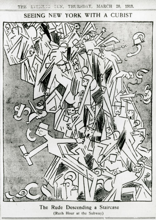 Armory Show postcard with reproduction of Marcel Duchamp's painting Nude Descending a Staircase, 1913. Walt Kuhn, Kuhn family papers, and Armory Show records, Archives of American Art, Smithsonian Institution.