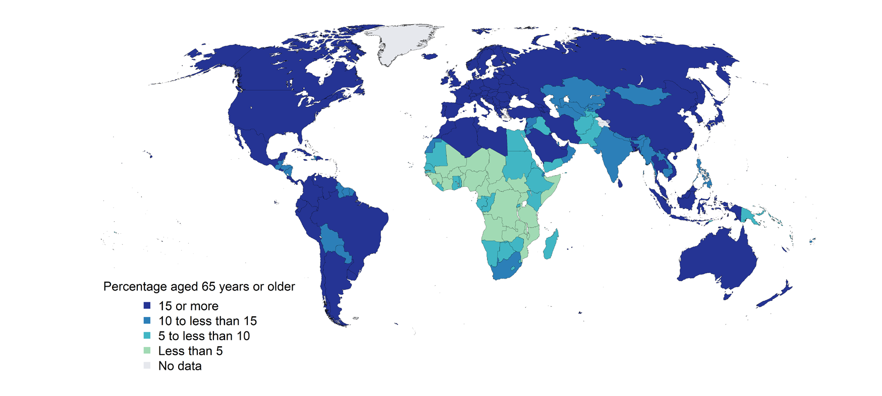 인구 고령화 속도는 향후 30년 동안 증가할 가능성이 높다.[10] 세계보건기구(World Health Organization)는 세계보건조사[14] 와 세계 고령화 및 성인 건강 연구(Study on Global Ageing and Adult Health, SAGE)를 통해 건강 및 웰빙 증거를 제공하기 위해 노력하고 있다.