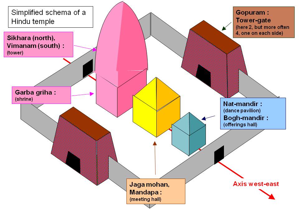 드라비다 건축 양식의 힌두 사원에서 가장 높은 구조물인 비마나는 사각형 또는 다각형 기단 위에 층을 이루며 세워지고 화려한 조각으로 장식되며, 사원 중심부인 가르바그리하를 덮고 꼭대기에는 칼라사라는 돔 형태 장식이 놓인다. - 힌두 건축 - 시카라