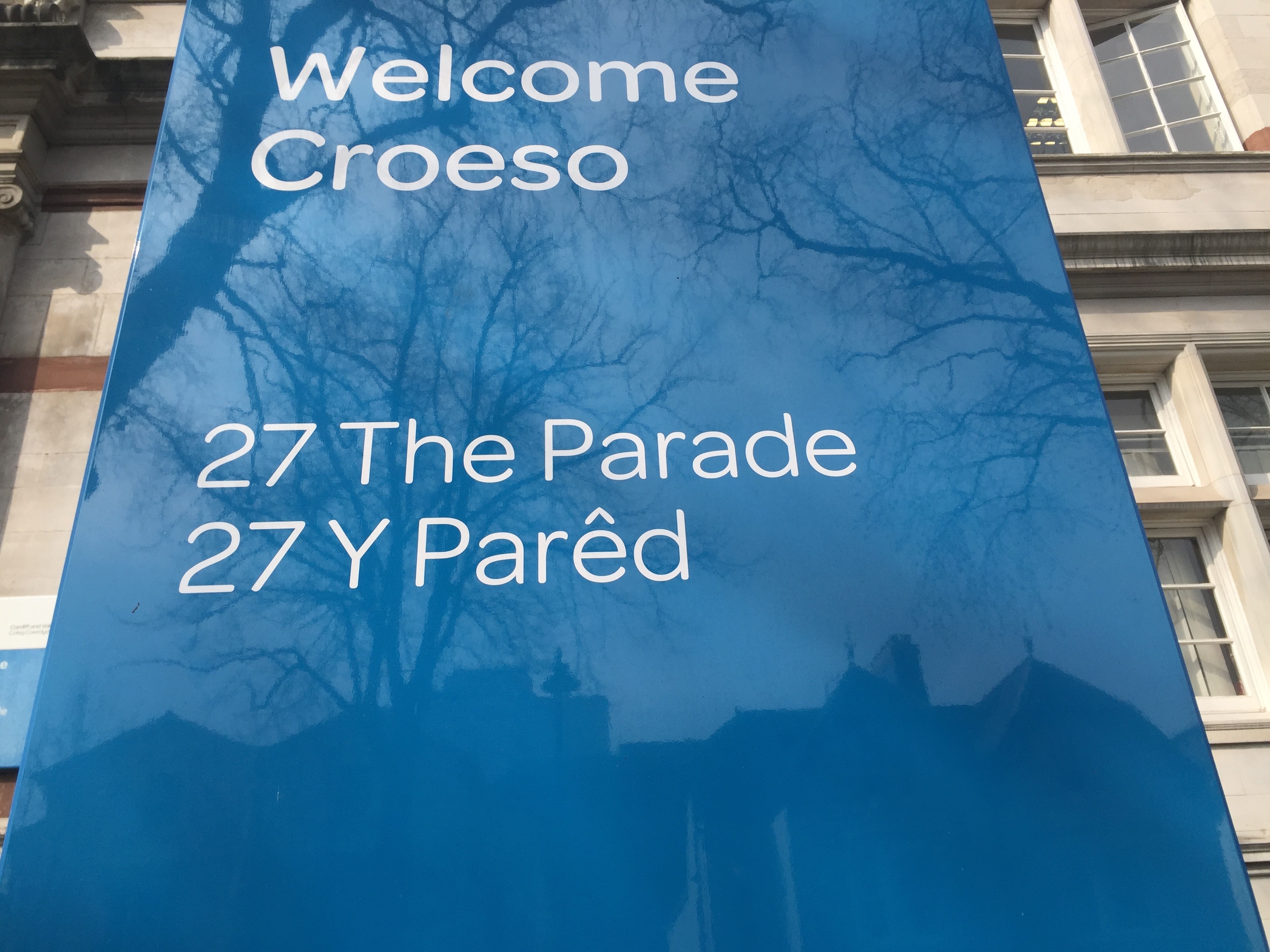웨일스어에서 굴절 부호가 길이와 강세를 나타내는 데 사용되는 이중 언어 표지판: ''parêd'' "퍼레이드", ''pared'' "칸막이 벽"과 대조됨.