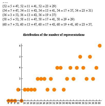 예를 들어, 6 이상 22 이하의 짝수를 홀수 소수의 합으로 나타내는 경우는 다음과 같다.