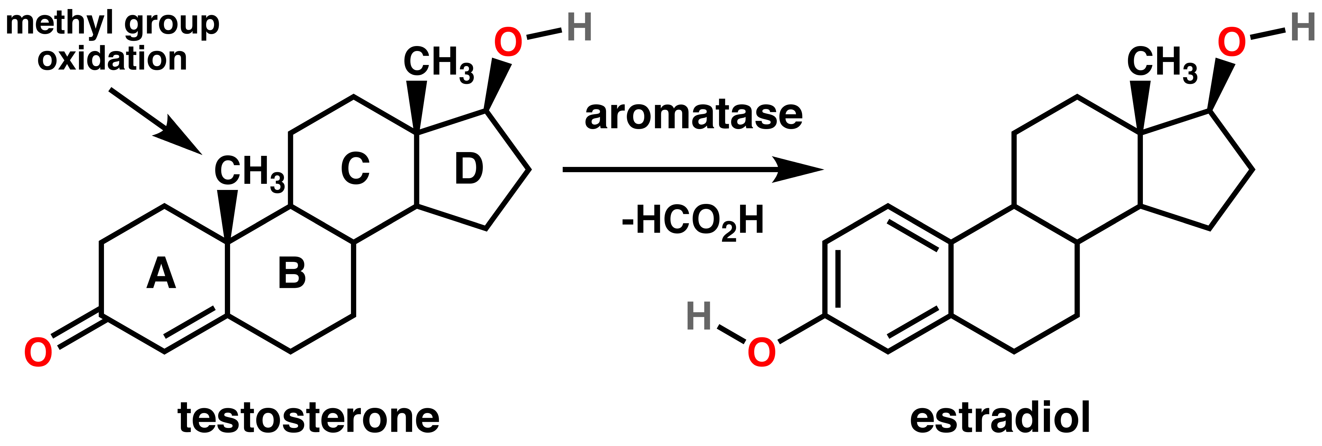 테스토스테론은 아로마타제 효소에 의해 에스트라디올로 대사될 수 있으며, 5α-환원효소에 의해 디하이드로테스토스테론(DHT)으로 대사될 수 있다.[96]