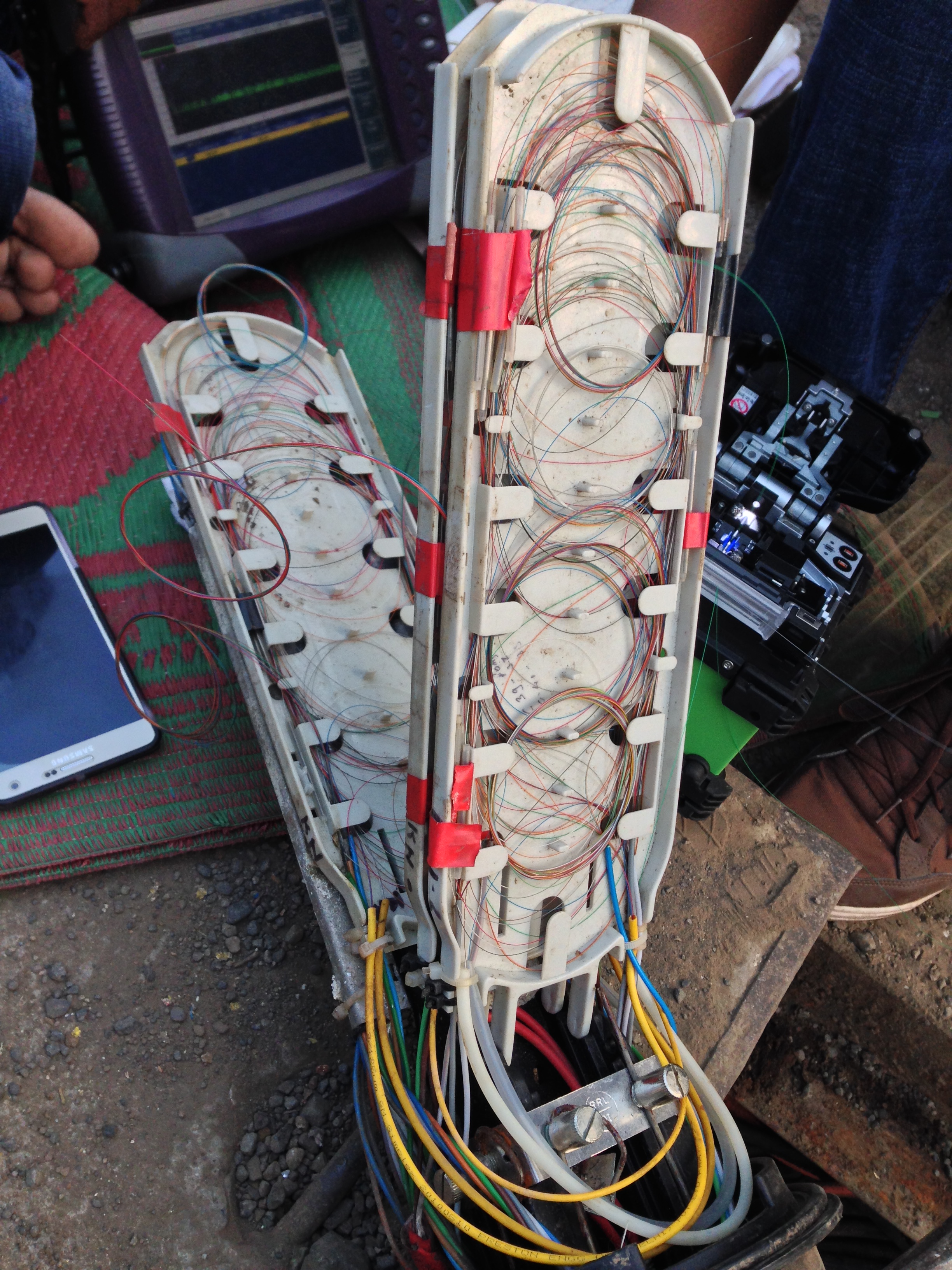 섬유 케이블 정션 박스의 고장 조사. 정션 박스 내부의 개별 섬유 케이블 가닥이 보인다.