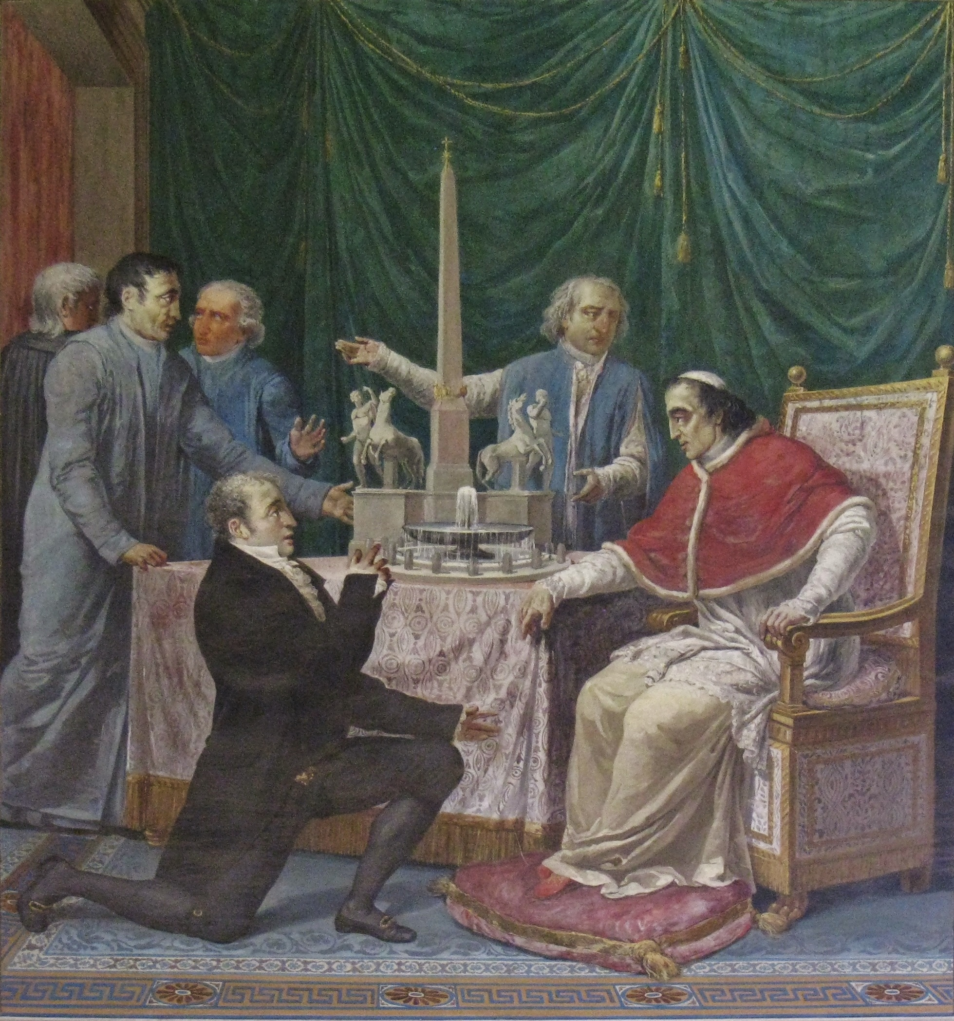 1799년 교황 비오 6세가 발랑스에서 사망한 후, 그의 후임자를 선출하기 위한 콘클라베가 1799년 11월 30일 베네치아의 베네딕토회 산 조르조 수도원에서 열렸다.[31] 3개월 이상 지속된 논의 끝에, 1800년 3월 14일 루이지 키아라몬티 추기경이 교황으로 선출되어 비오 7세로 명명되었다.[7]프랑스 혁명의 영향으로 교황 삼중관이 없는 상황에서, 파피에마셰로 만든 임시 교황관을 쓰고 3월 21일 인근 수도원 교회에서 즉위식을 거행했다. 프랑스는 로마를 점령하고 비오 6세를 망명시키면서 성좌가 소유한 삼중관을 압수했었다. 새 교황은 그 후 로마로 떠났고, 갤리조차 없는, 겨우 항해 가능한 오스트리아 선박 "벨로나"를 타고 항해했다. 12일간의 항해는 페사로에서 끝났고, 그는 로마로 향했다.