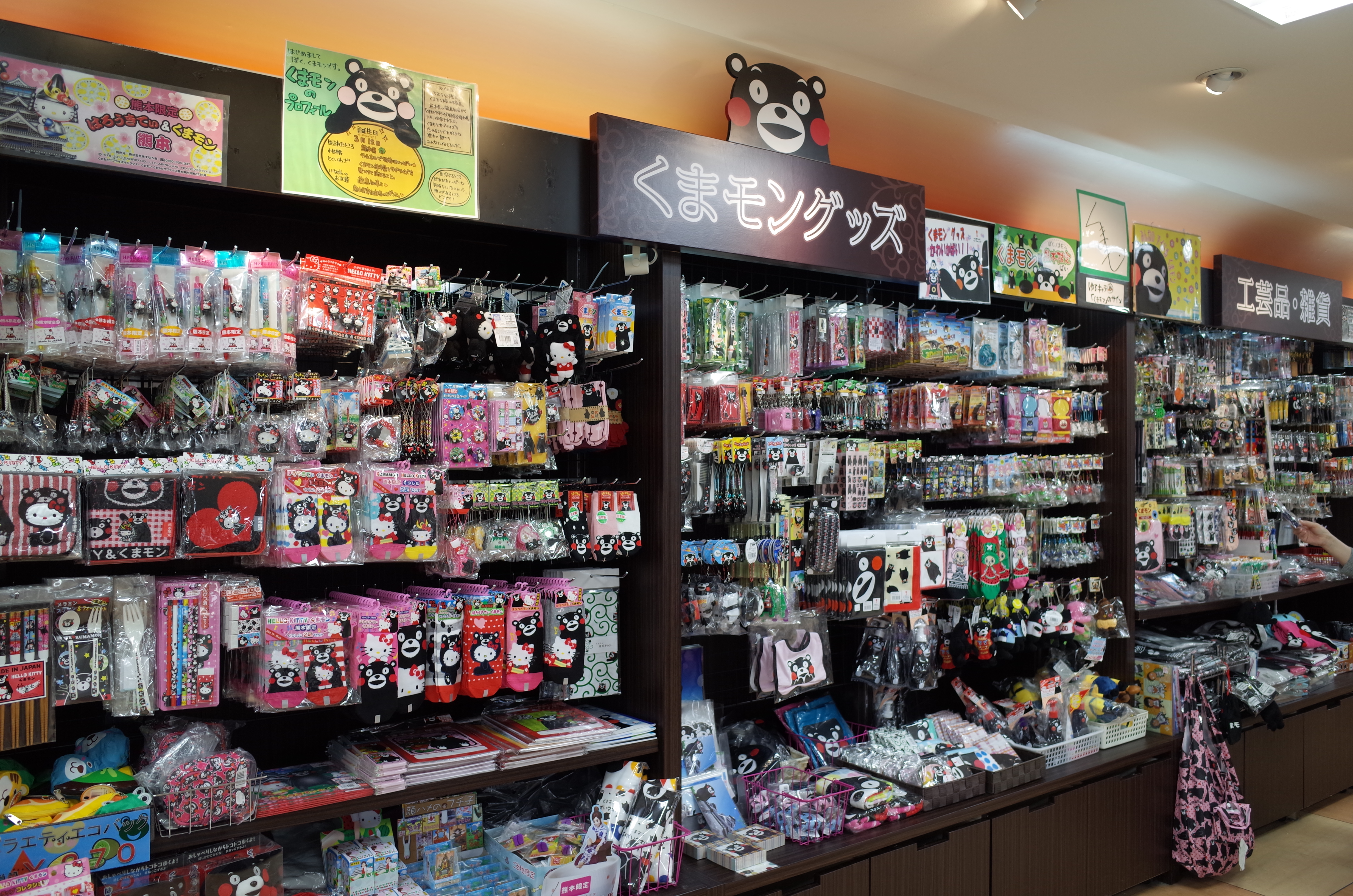 구마몬 상품 공식 매장은 없지만, 구마모토현에서는 구마모토현청 지하 매점·구마모토역·현민 백화점·쓰루야 백화점[127], 긴키에서는 로손 아즈치정 2초메점 내 "구마모토 요카몬 SHOP", 간토에서는 긴자 구마모토관·구마모토현 물산센터 키치조지점 등의 안테나 숍, 또는 통신 판매로 구입할 수 있다. 유루캬라 그랑프리 2011 우승 후에는 후쿠오카현·가고시마현 등 규슈에서도 취급하는 샵이 늘고 있다[128].