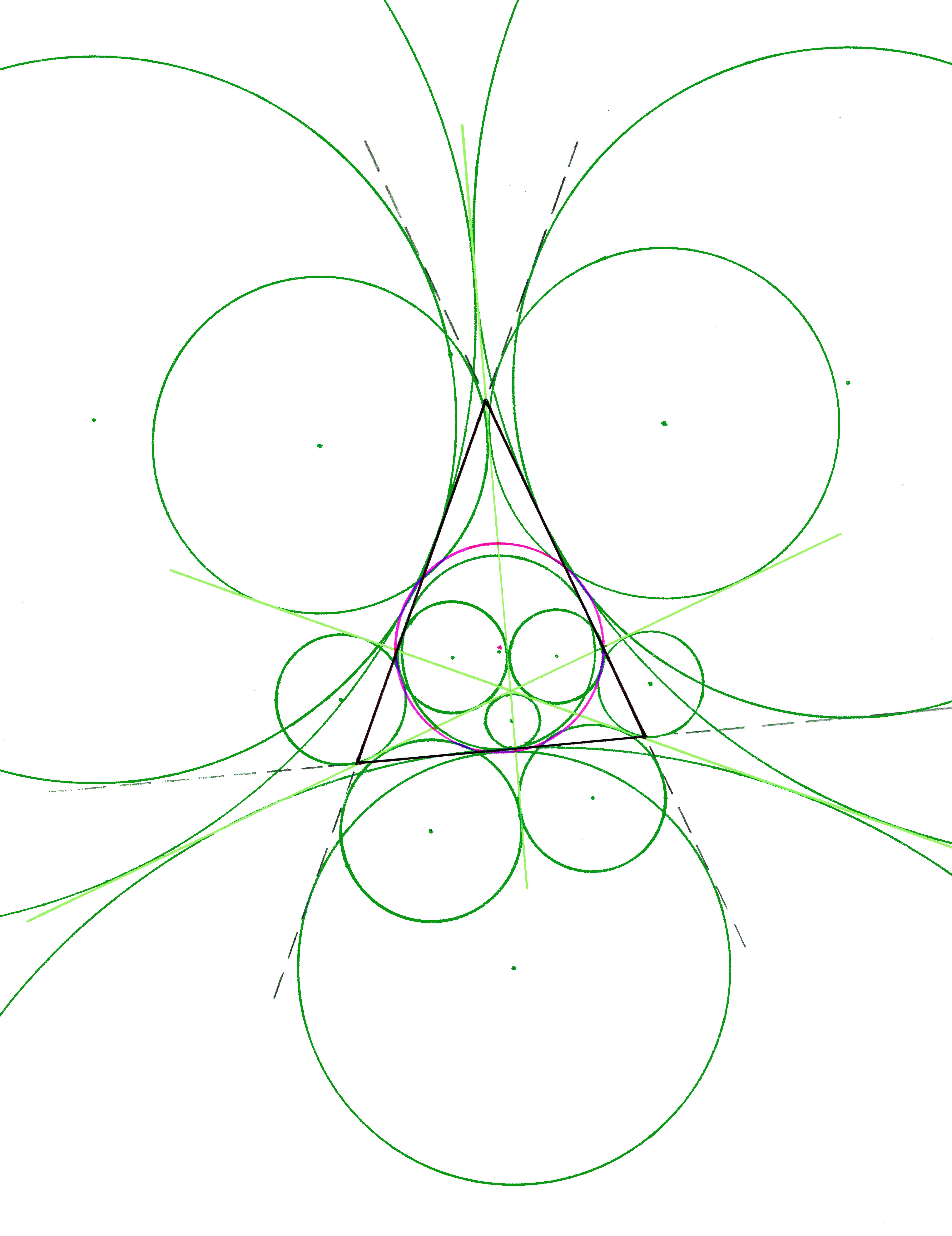 > ... 삼각형의 높이의 발을 지나는 원은 차례로 삼각형의 세 변에 접하는 네 개의 모든 원에 접한다...