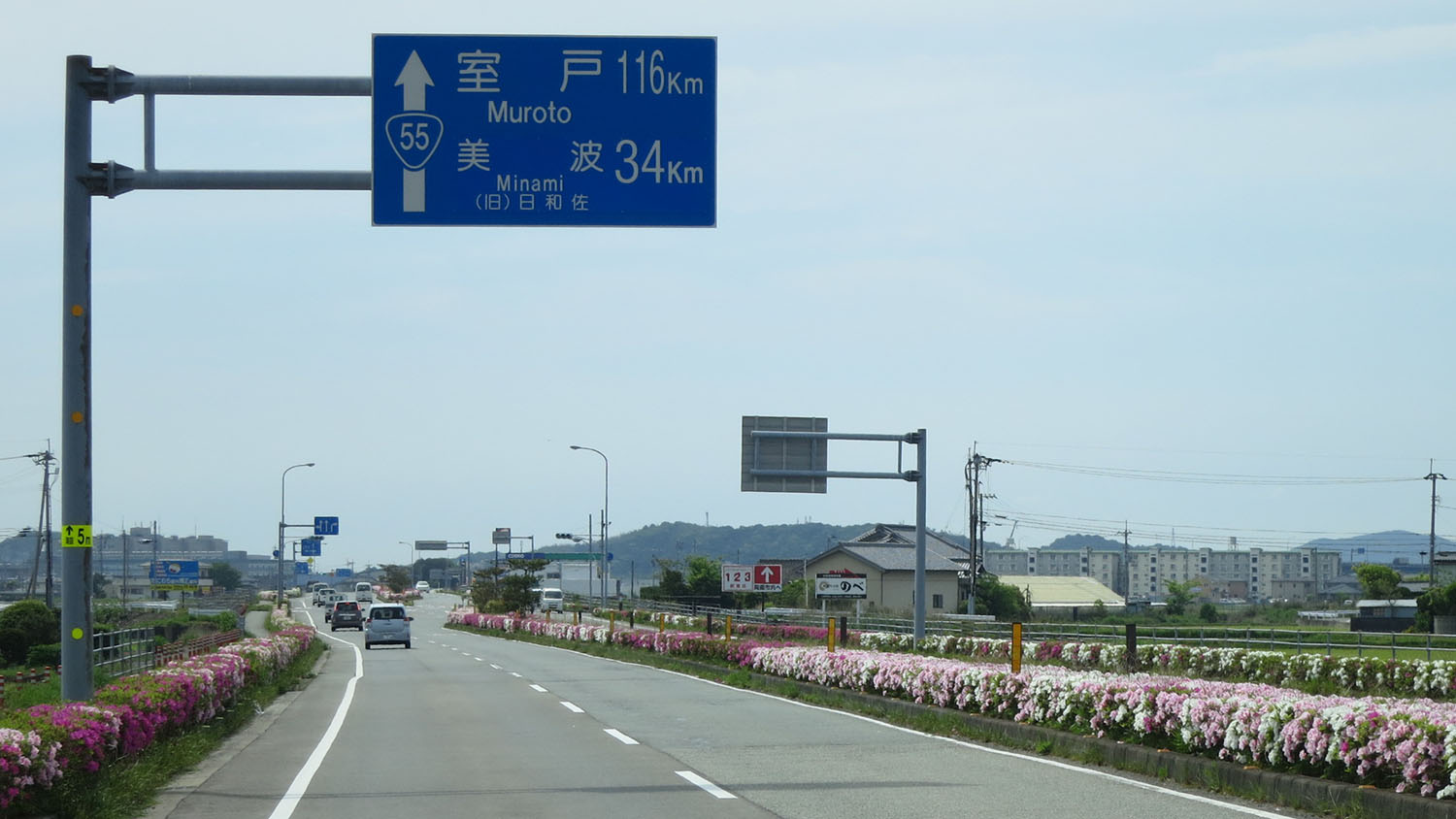 국도 제55호선은 시코쿠 남쪽 해안을 따라 이어지는 도로로, 경관이 아름답지만 태풍이 자주 발생하는 지역이다. 여름부터 가을까지 도로 붕괴, 낙석, 높은 파도 등으로 인해 통행 제한이 자주 시행되며,[2] 대규모 쓰나미 경보 발령 시에도 통행 제한이 있을 수 있다.[1]