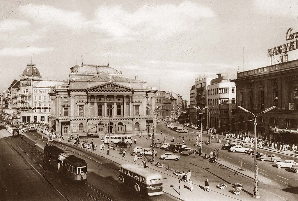1908년, 극단은 블라하 루이자 광장의 '국민 극장'으로 옮겨갔다. 그 후 수십 년 동안 극단은 '국민 극장'의 세입자였으며, 건물의 상태는 계속 악화되었다. 1963년, 당국은 지하철 노선 건설을 이유로 건물 철거를 결정했다.[2] 1년 후 운영이 중단되었고, 1965년 4월 23일에 건물이 철거되었다.[2] 극단은 나지메죄 거리의 개조된 '페퇴피 극장'(오늘날 탈리아로 알려짐)으로 이전했다. 2년 후, 다시 헤베시 샨도르 광장의 옛 '머저르 극장'으로 이전했다.2. 4. 임시 극장 시대 (1965년 ~ 2002년)