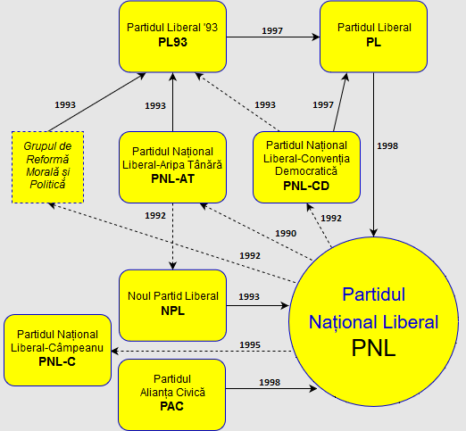 루마니아 혁명 직후인 1990년 1월, 루마니아 국민자유당(PNL)이 재창당되었다. 1990년대 초, 이 당은 라두 컴페아누와 미르체아 이오네스쿠-퀸투스가 이끌었는데, 두 사람 모두 역사적 PNL의 전 당원이었다.[44]