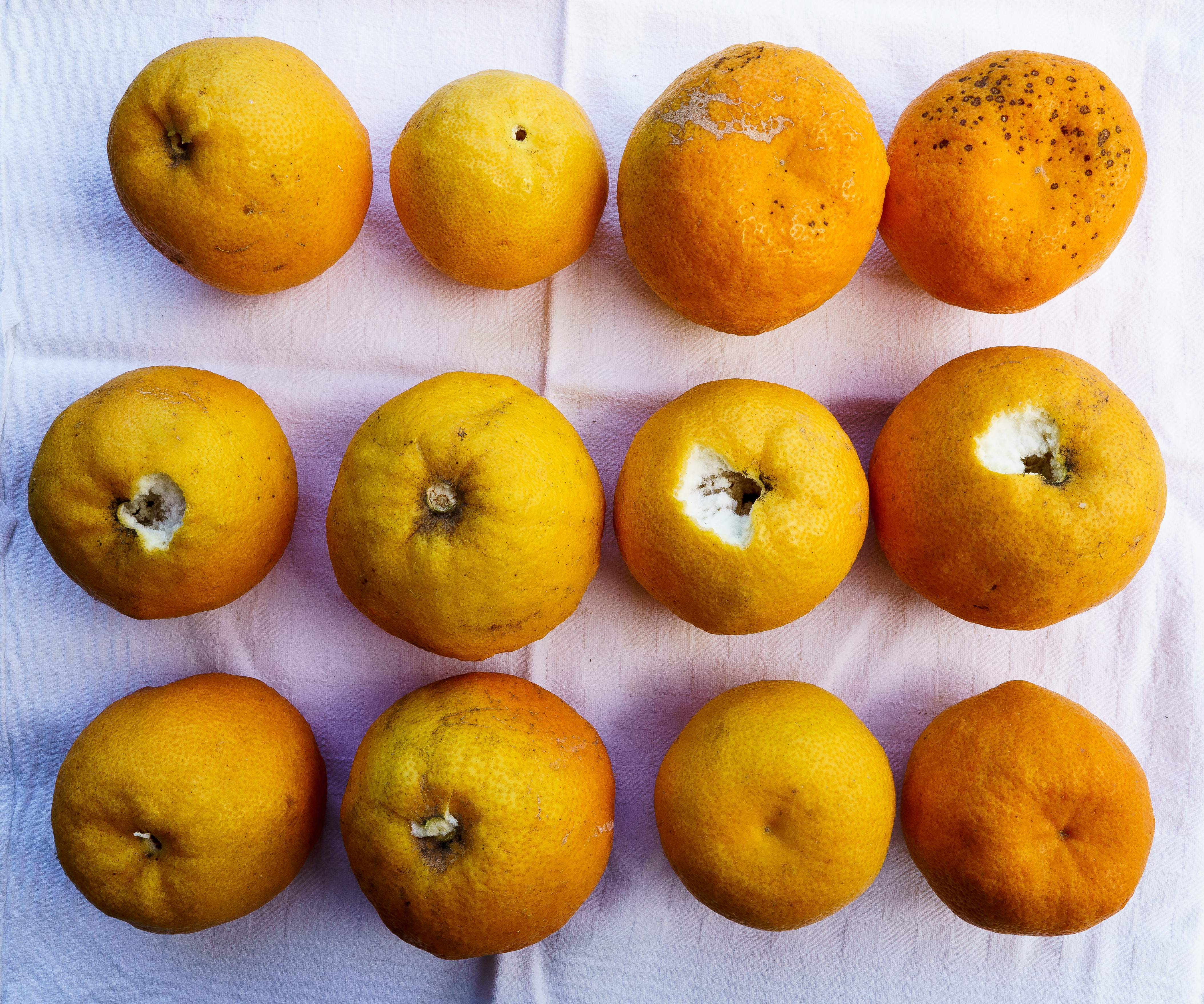 감귤류 질병 목록감귤 농장의 질병에는 감귤 흑점병(곰팡이), 감귤 궤양병(세균), 감귤 황룡병(세균, 해충에 의해 전파됨) 및 스위트 오렌지 겹딱지병(''Elsinöe australis'')이 있다.[40] 감귤 식물은 식물 질병의 매개체 역할을 하는 외부 기생충에 감염되기 쉽다. 예를 들어 진딧물은 피해를 주는 감귤 트리스테자 바이러스를 전파하며,[41] 진딧물과 유사한 아시아 감귤나무 이는 심각한 감귤 황룡병을 유발하는 세균을 옮길 수 있다.[42][43] 이는 플로리다,[44][45] 캘리포니아,[43] 및 전 세계적으로 생산을 위협하고 있다. 감귤 과수원은 감귤 (''Tylenchulus semipenetrans'') 및 초 nematode (''Hemicycliophora'' spp.)를 포함한 기생성 선충의 공격을 받는다.[46][47]