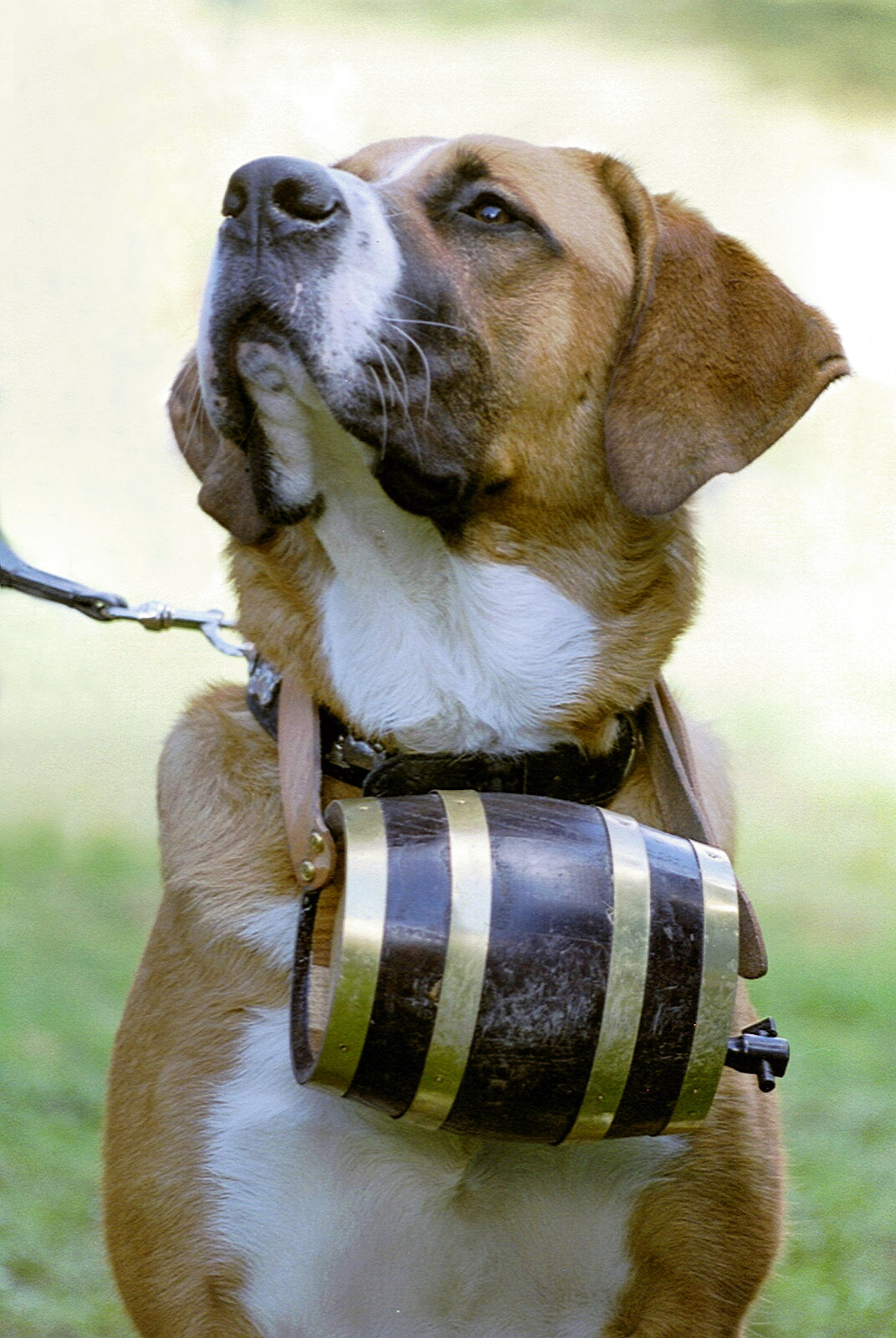 세인트 버나드 개는 깊은 눈 속을 헤치고 냄새로 길 잃은 사람을 찾을 수 있을 만큼 충분히 크게 길러졌다. 개가 수도원에서 사용되었다는 최초의 증거는 살바토르 로사가 1690년에 그린 두 개의 그림이다. 사람들은 개가 목에 작은 브랜디 통을 매달고 다녔다고 믿었는데, 이는 술이 약효가 있다고 믿었기 때문이다. (하지만, 이것은 전설일 뿐이다.)[38]