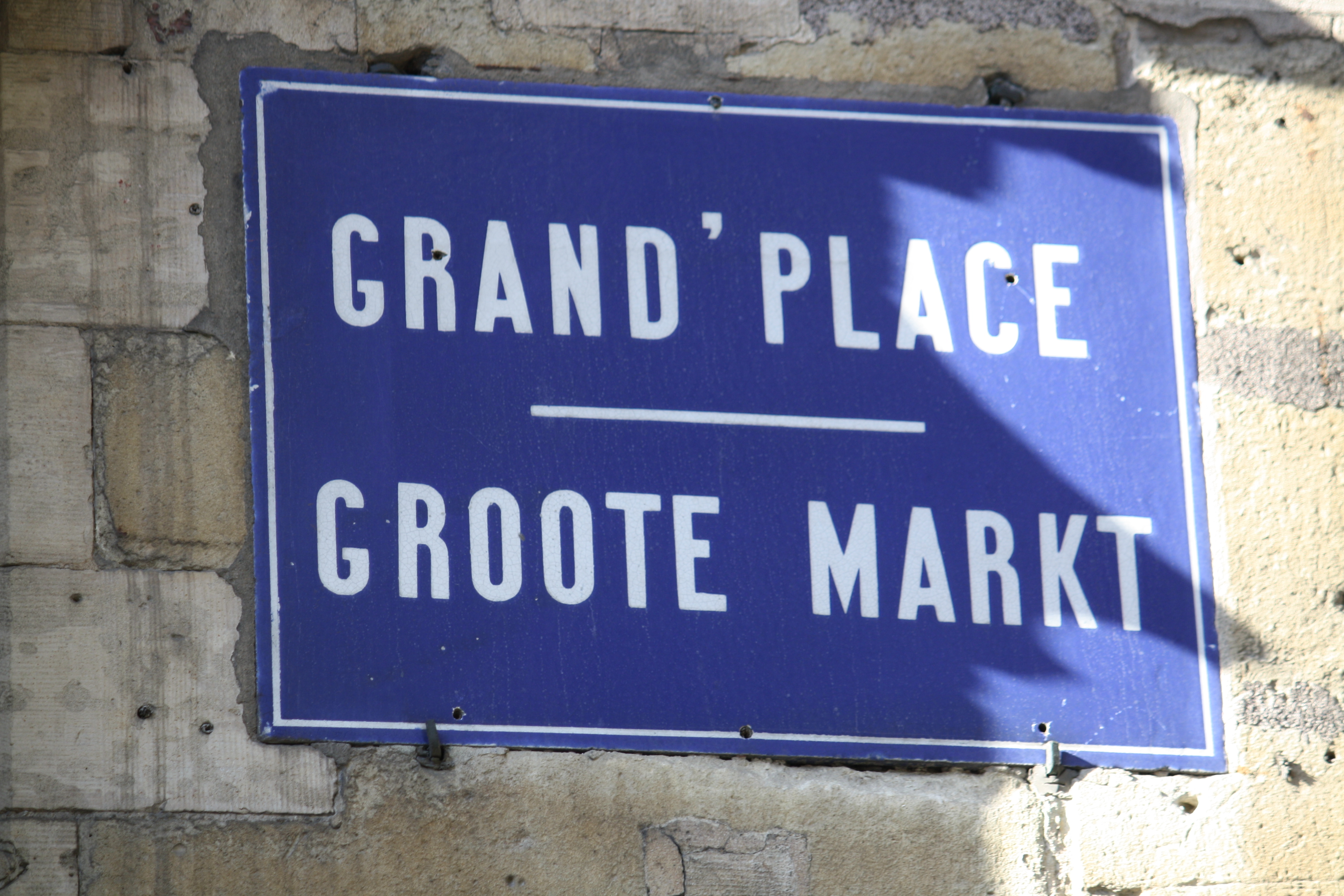 요즘에는 프랑스어 ''Grand-Place''와 네덜란드어 ''Grote Markt''가 가장 일반적으로 사용된다. 역사적인 철자 방식인 프랑스어 ''Grand'Place''와 네덜란드어 ''Groote Markt''는 구식이지만,[8][9] 광장의 이름을 나타내는 벽면 표지판과 같은 특정 출처에서는 여전히 사용되고 있다. 브뤼셀 방언으로는 그랑플라스를 ''Gruute Met''(흐루터 멧)라고 부른다.[12]