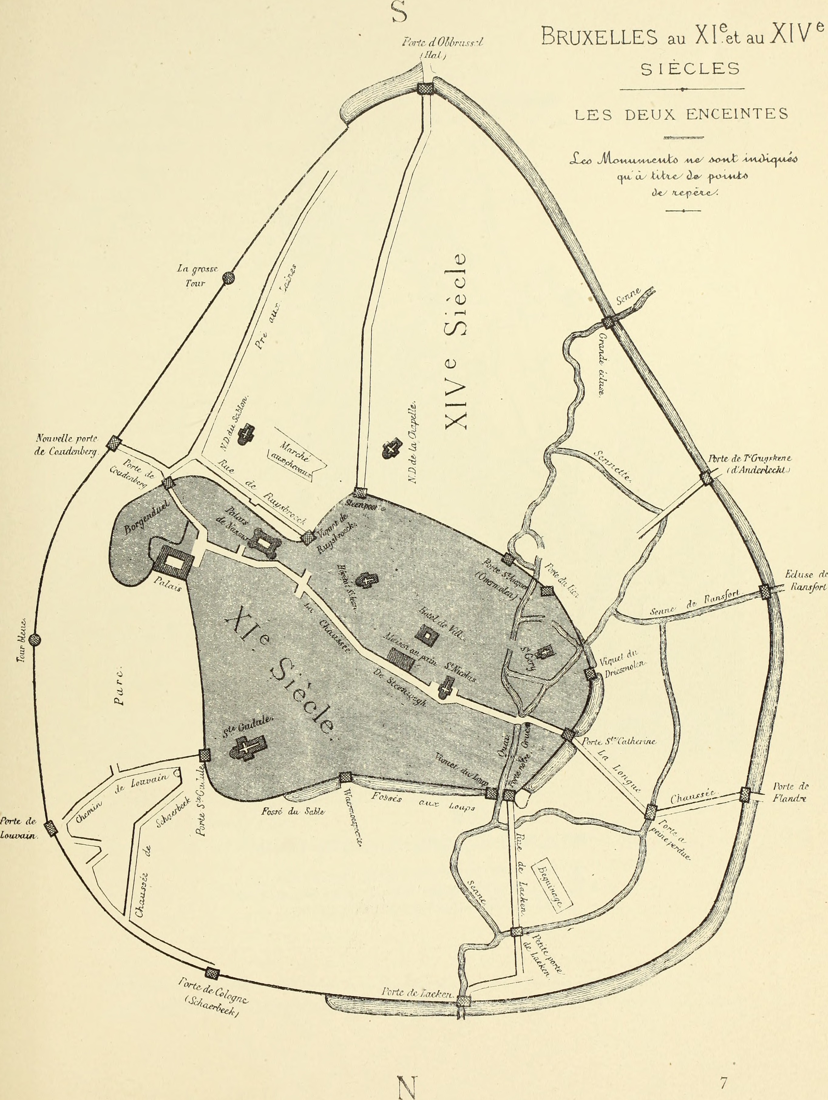 Map of Brussels in the 11th and 14th centuries from Bruxelles à travers les âges