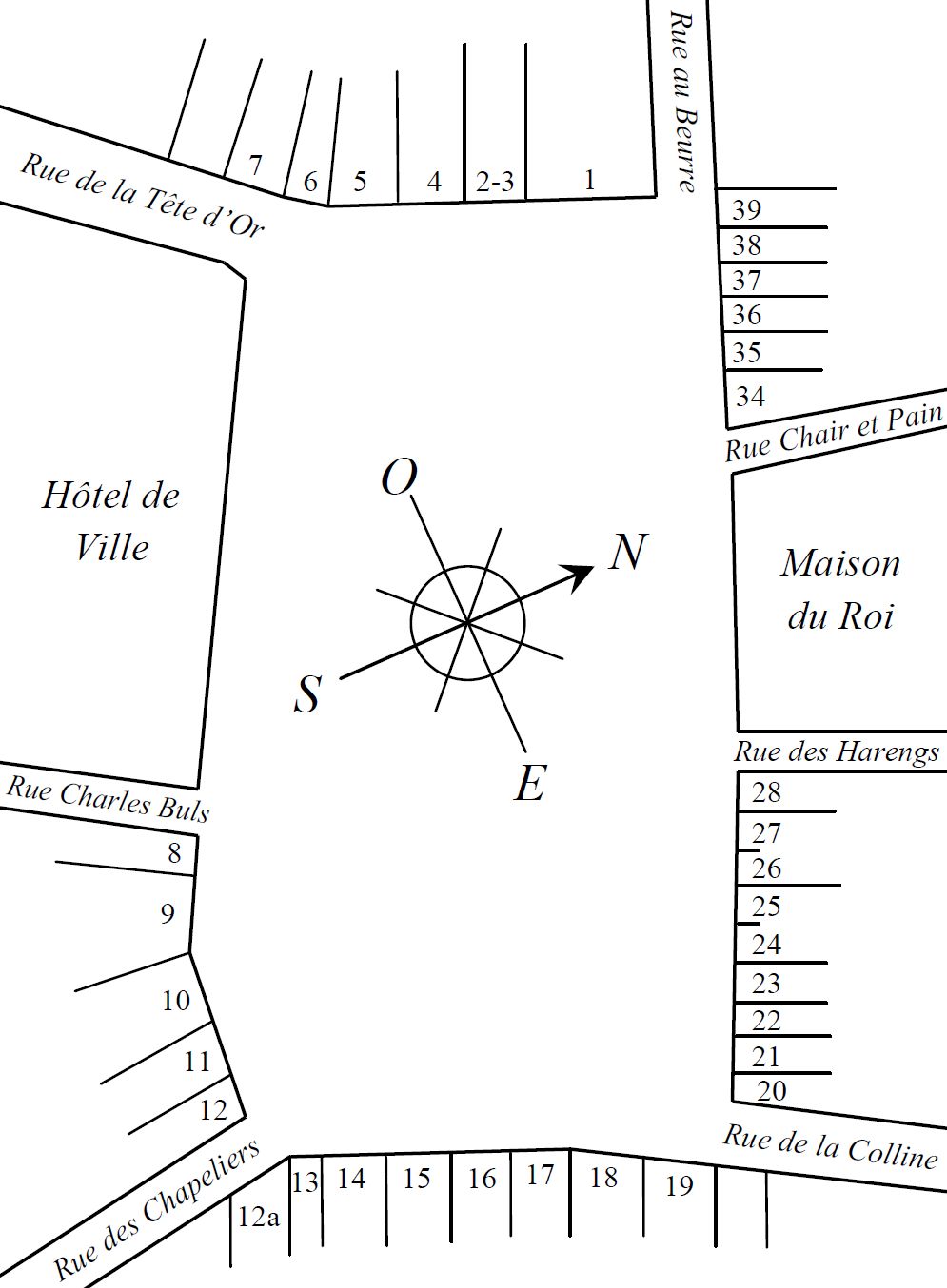 각 가옥은 길드의 이름 외에도 고유한 이름을 가지고 있다. 가옥 번호는 광장 북쪽 모서리의 Rue au Beurre|뵈르 거리프랑스어 왼쪽에서 시작하여 반시계 방향으로 매겨져 있다.