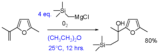 프랭클랜드는 디알킬아연을 에테르 중에서 제조하는 방법을 시도했었다. 하지만 이 방법으로는 디알킬아연에 에테르가 배위된 화합물이 침전되어 사용하기 어려웠다. 1900년 그리냐르는 이 방법을 마그네슘에 적용하여, 아연과는 달리 균일한 유기금속 화합물 용액을 얻었고, 이 유기금속 화합물이 많은 카르보닐 화합물과 반응한다는 것을 발견했다.[28]