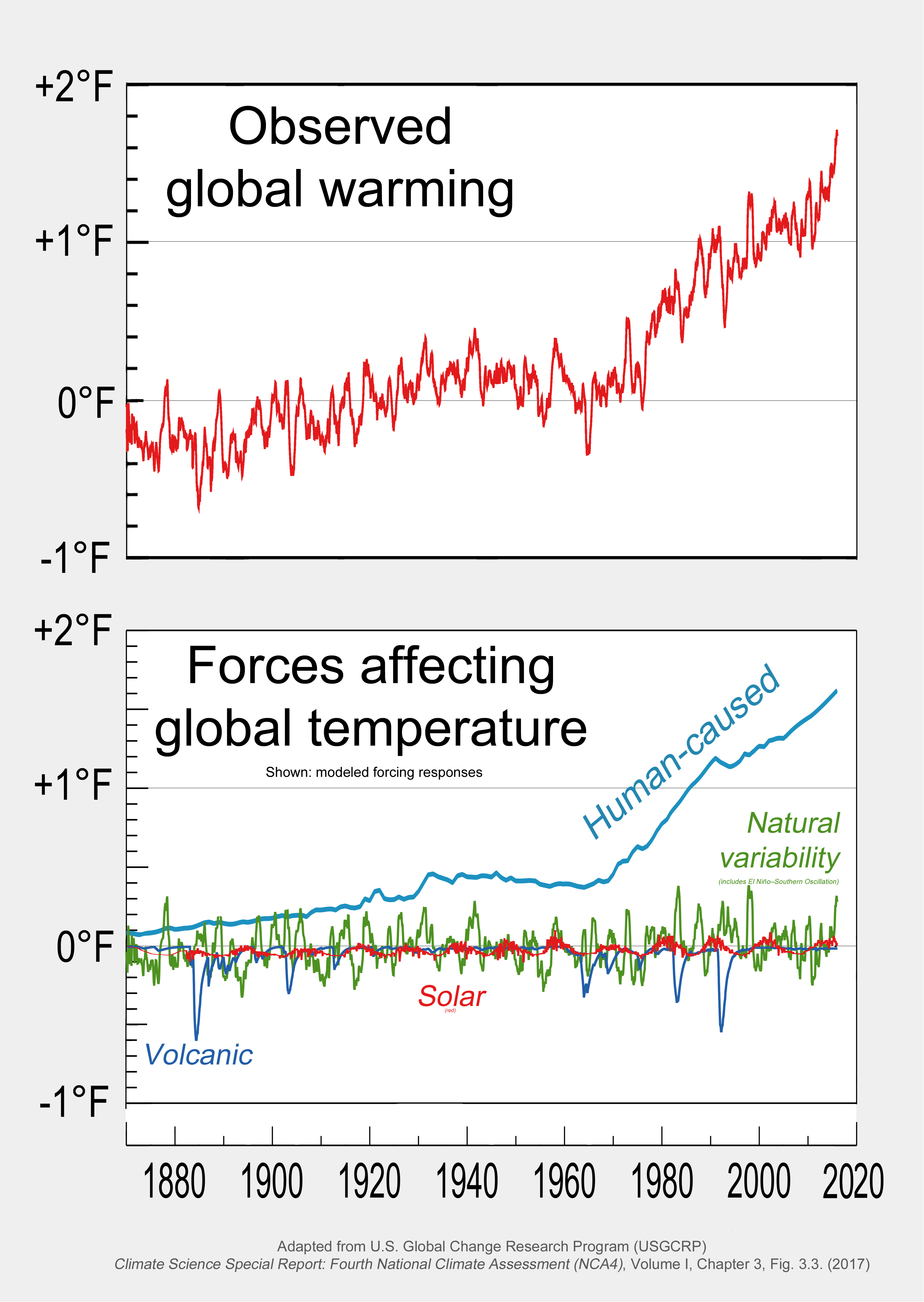 - 반론: 이러한 자연적 요인만으로는 20세기 후반부터 관측되는 급격한 지구 온난화를 설명할 수 없다.[337] 인위적인 온실가스 증가가 없었다면, 1900년대 후반의 기온은 오히려 하락했을 것이다.[338]