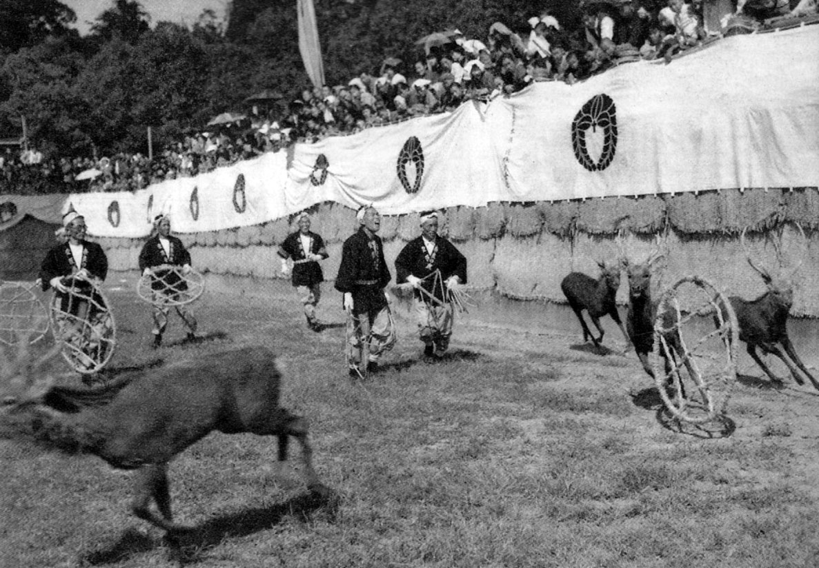 가스가타이샤 전설에 따르면, 다케미카즈치가 흰 사슴을 타고 미카사 산에 나타난 후 나라의 꽃사슴은 신성한 존재로 여겨졌다.[3][4] 고후쿠지에서도 사슴을 신성시했다.[4]다이카 개신 당시, 소가노 이루카를 죽인 후 소가노 마코와 소가노 이루카의 이름을 합쳐 "바카"(바보)라는 뜻으로 사슴을 풀어 놓았다는 이야기가 전해진다. 1637년까지 신성한 사슴을 죽이는 것은 중죄였다.[4]