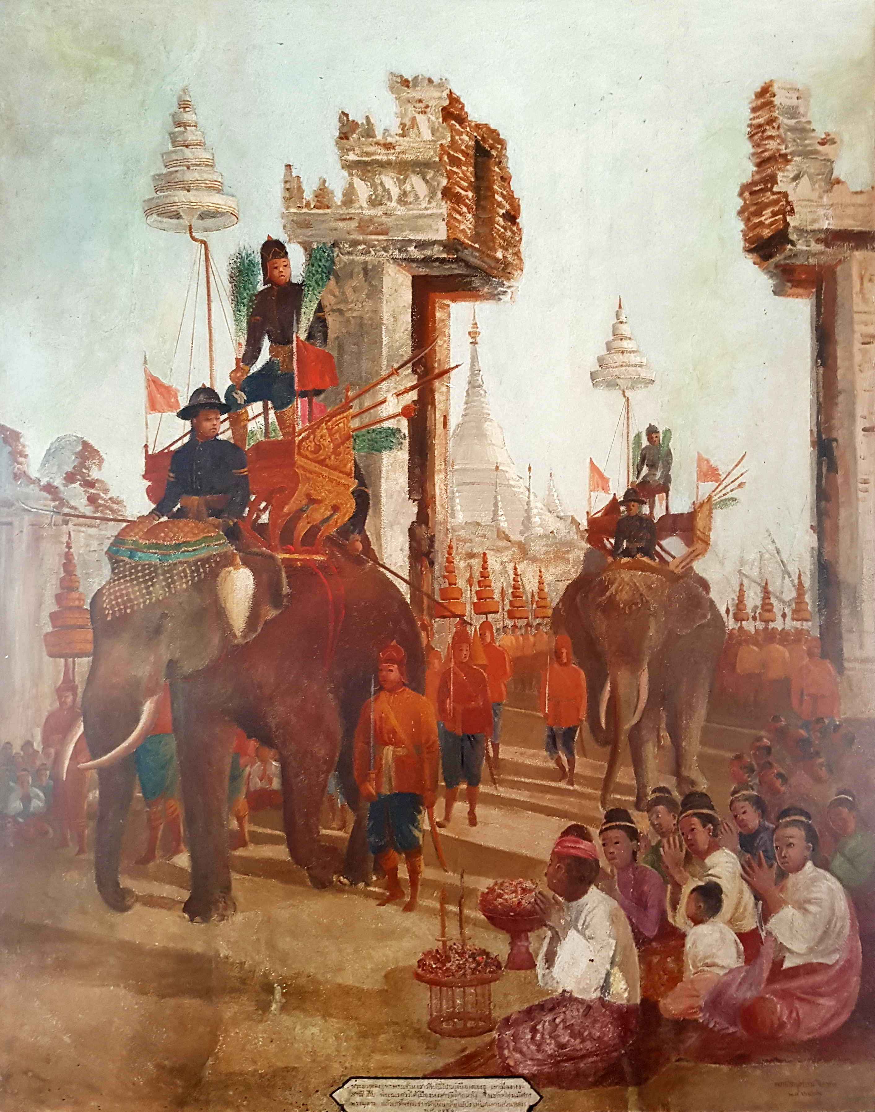 1590년 아버지 왕이 죽자 왕위를 계승하였다. 1594년부터 미얀마를 침공하여, 1600년에는 미얀마의 수도 페구를 함락시켰다.[45] 나레수안은 무인으로서 수많은 전투에서 직접 군을 지휘했으며, 캄보디아와의 전투에서는 프라야 라웨크 왕을 사로잡아 참수하고, 그 피로 발을 씻는다는 인도차이나 반도에서 행해지던 전승 의식을 치렀다.[45]4. 2. 코끼리 전투와 버마 격퇴