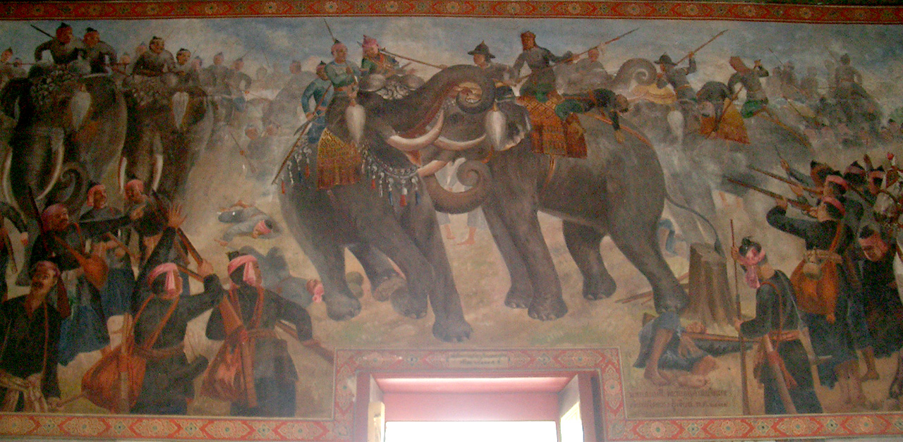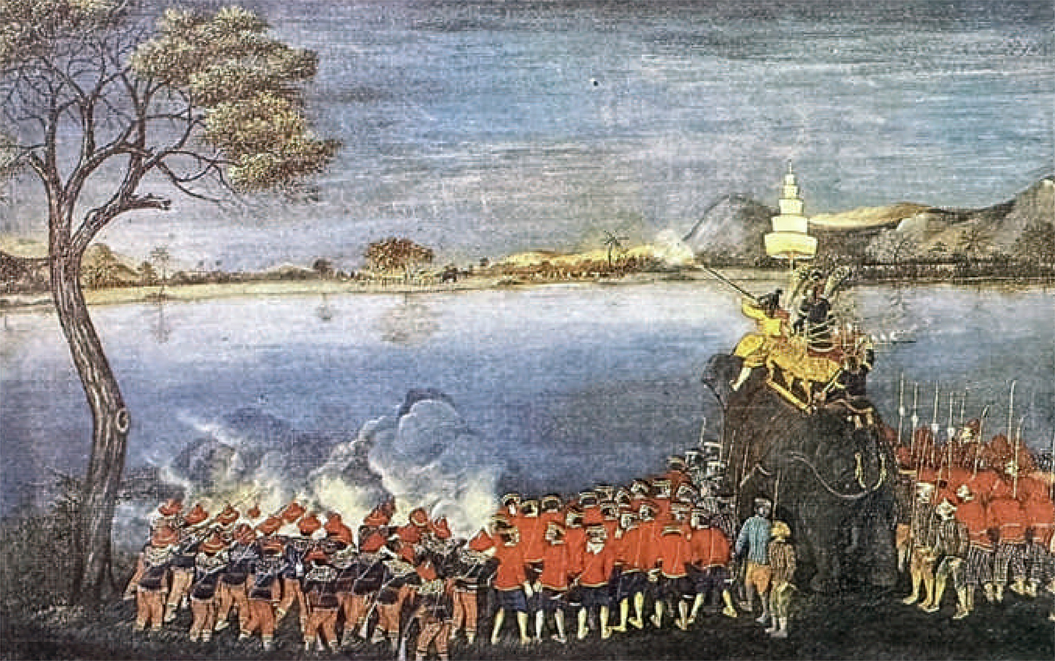 > [W]때때로 페구 왕자와 젊은 샴 왕자(둘 다 코끼리에 타고 왕실 복장을 하고 있었음)는 자제력을 잃고, 양쪽 군대를 떠나 서로 맹렬하게 공격했다. 샴 왕자는 창으로 상대방의 몸을 꿰뚫고, 상대방의 코끼리를 빼앗았다.