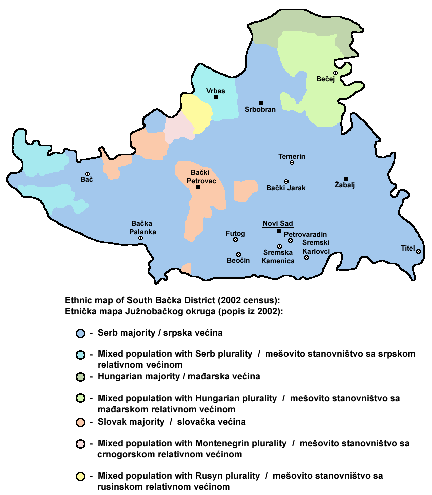 세르비아인이 다수인 지방 자치 단체는 노비사드 시 (79%), 스렘스키카를로브치 (78%), 티텔 (87%), 자발 (85%), 베오친 (70%), 스르보브란 (66%), 바치카팔란카 (79%), 테메린 (68%), 브르바스 (55%)이다. 바치키페트로바츠는 슬로바키아인이 65%로 다수를 차지하며, 바치는 세르비아인이 47%로 상대적 다수, 베체이는 헝가리인이 46%로 상대적 다수이다.