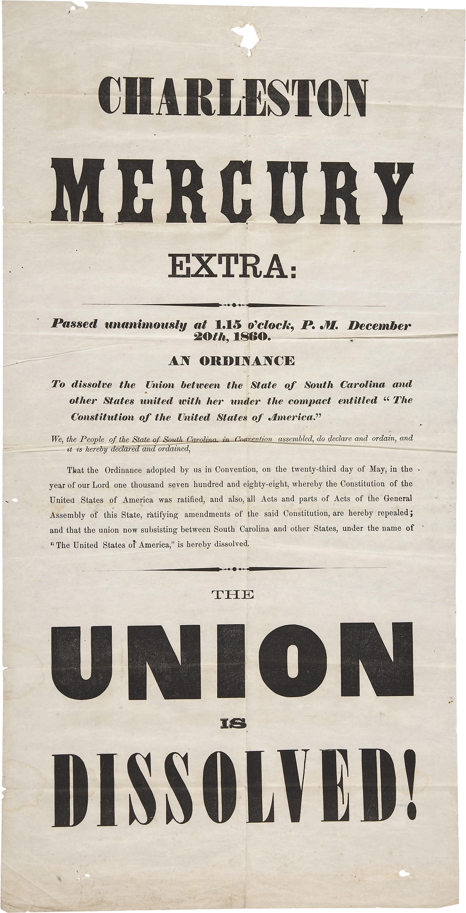 1860년 링컨이 대통령으로 선출되었고, 링컨 자신은 노예를 소유한 가문의 딸과 결혼했지만, 노예 소유자는 링컨과 연방 정부와의 관계를 유지할 수 없게 되었고, 결국 미합중국에서 남부 탈퇴라는 극단적인 선택을 가져오게 되었다.[57]