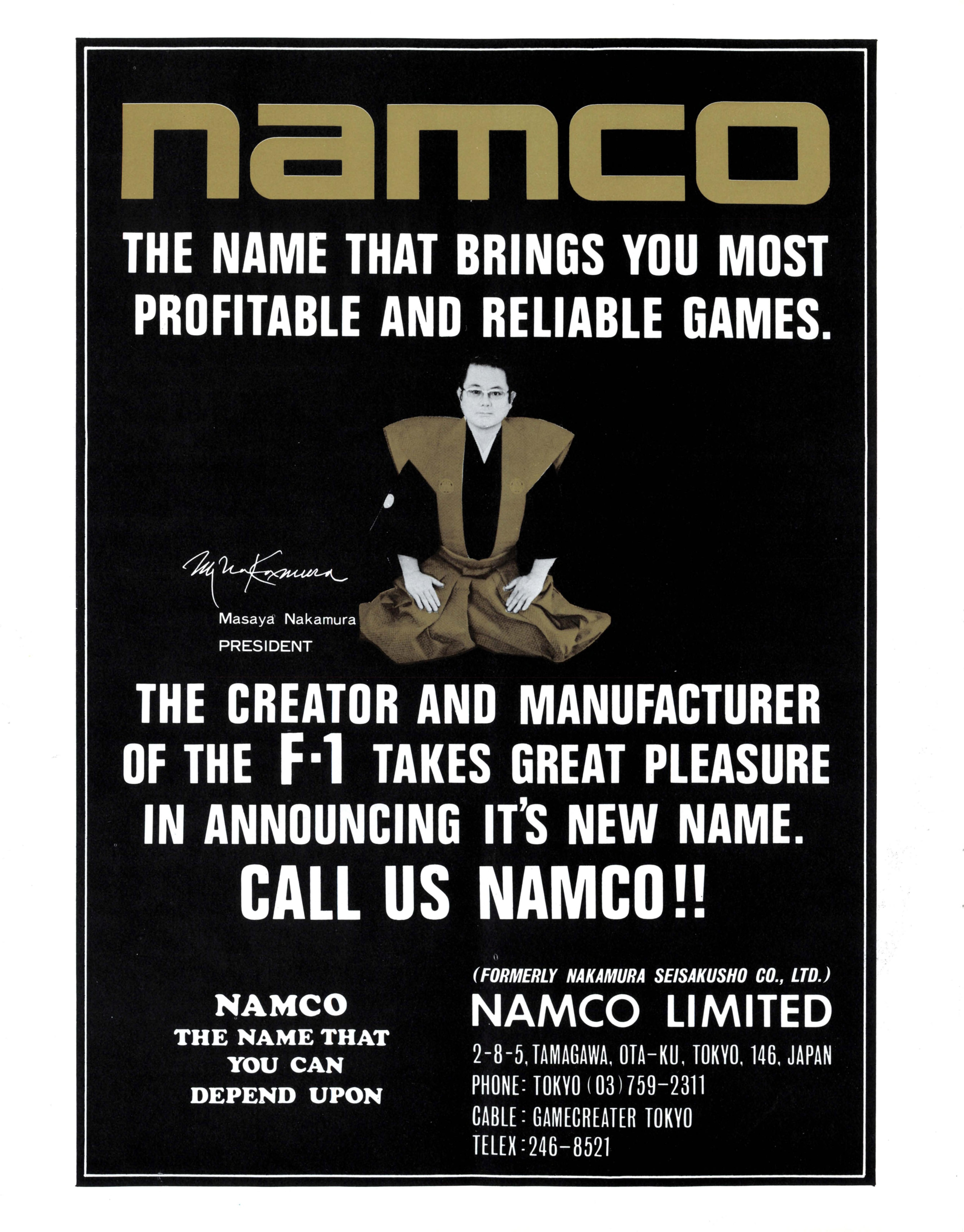 결국 아타리 재팬은 나카지마 히데유키에게 넘겨졌고, 미국에서 어려움을 겪던 아타리 공동 설립자 놀란 부시넬은 일본 지사를 매각하기로 결정했다. 론 고든은 아타리 재팬의 매수자를 찾는 임무를 맡았고, 세가와 타이토가 거절한 후 나카무라에게 제안했다. 나카무라는 2억 9600만 엔(미화 118만 달러)에 인수 제안을 수락했지만, 마감일까지 돈을 지불할 수 없다고 알렸다.[16] 결국 부시넬은 나카무라가 55만 달러를 먼저 지불하고 3년 동안 매년 25만 달러를 지불하는 조건으로 아타리 재팬 인수를 허용했다.[16] 이 인수를 통해 나카무라 제작소는 일본 전역에 아타리 게임을 유통할 수 있게 되었고, 일본 최대 아케이드 게임 회사 중 하나가 되었다.[5][17]