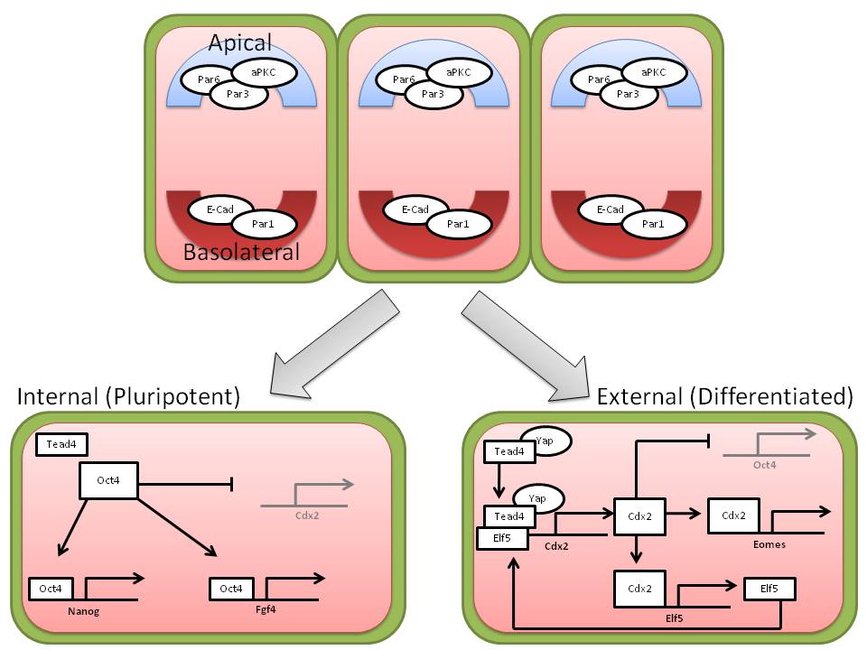이러한 전사 인자들은 양성 피드백을 통해 영양외배엽 또는 내세포집단 분화에 기여하며, 8-16세포기에 시작되는 분극화 과정과 관련이 있다. 정단면-하측면 극성은 정단면 마커인 Par3, Par6, aPKC와 하측면 마커인 E-Cadherin을 통해 확인할 수 있다.[18]