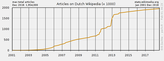2011년 10월, 여러 봇이 단 11일 만에 80,000개의 문서를 생성했다.[11][12] 같은 해 12월 17일, 100만 개의 문서를 달성하여 영어 위키백과, 독일어 위키백과, 프랑스어 위키백과에 이어 네 번째로 100만 문서를 돌파한 위키백과가 되었다.2013년 3월에는 프랑스어 위키백과를 제치고 세계에서 세 번째로 큰 규모의 위키백과가 되었으며, 같은 해 6월에는 독일어 위키백과를 제치고 세계에서 두 번째로 큰 규모의 위키백과가 되었다. 네덜란드어 위키백과 문서의 대다수(59%)는 인터넷 봇에 의해 생성되었다.[10] 2020년 3월 8일에는 200만 개의 문서를 달성하였다.