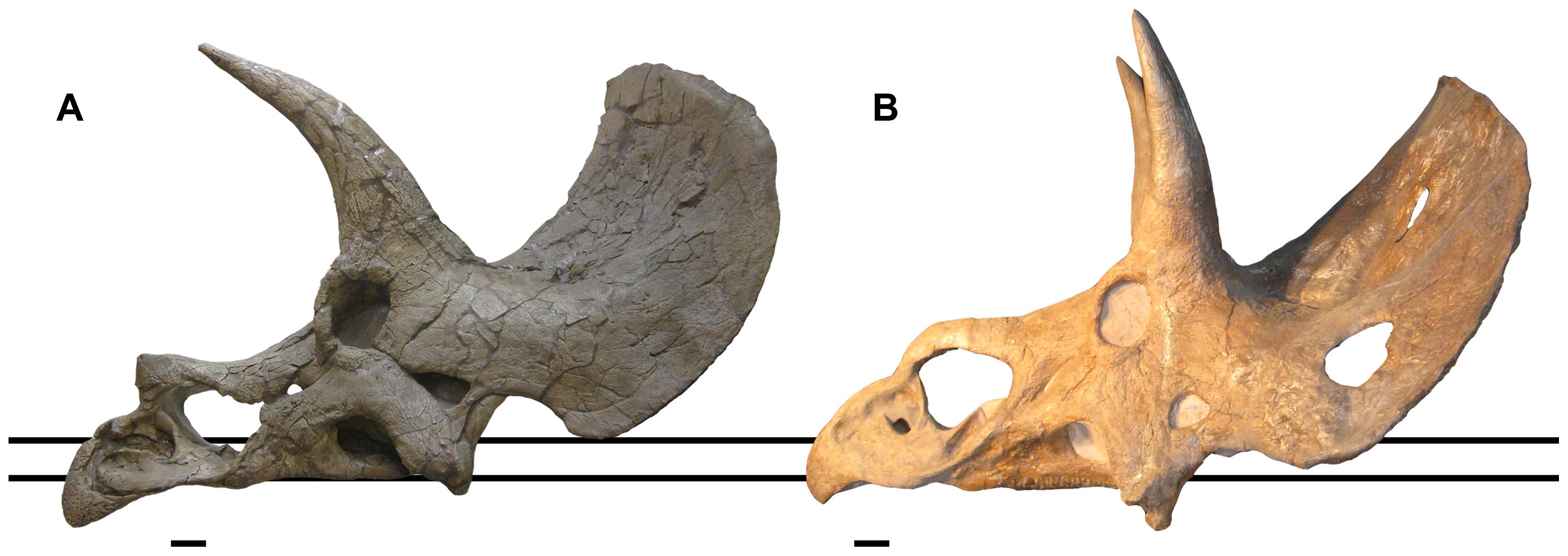 네도케라톱스와 트리케라톱스 호리두스(''Triceratops horridus'')로 언급된 화석 간의 또 다른 차이점은 현저하게 짧고 둥근 코 "뿔"이다. 스카넬라와 호너는 USNM 2412 두개골의 코 뿔이 동물이 살아있을 때 또는 화석화될 때 손실되었을 수 있다고 제안했다.[8] 그러나 각룡류의 뿔은 연령대와 개체 간에 큰 변동성을 보이며, ''T. 호리두스''에 더 확실하게 기인하는 일부 표본도 비슷한 코 뿔 모양을 가지고 있다는 점에 주목했다.
