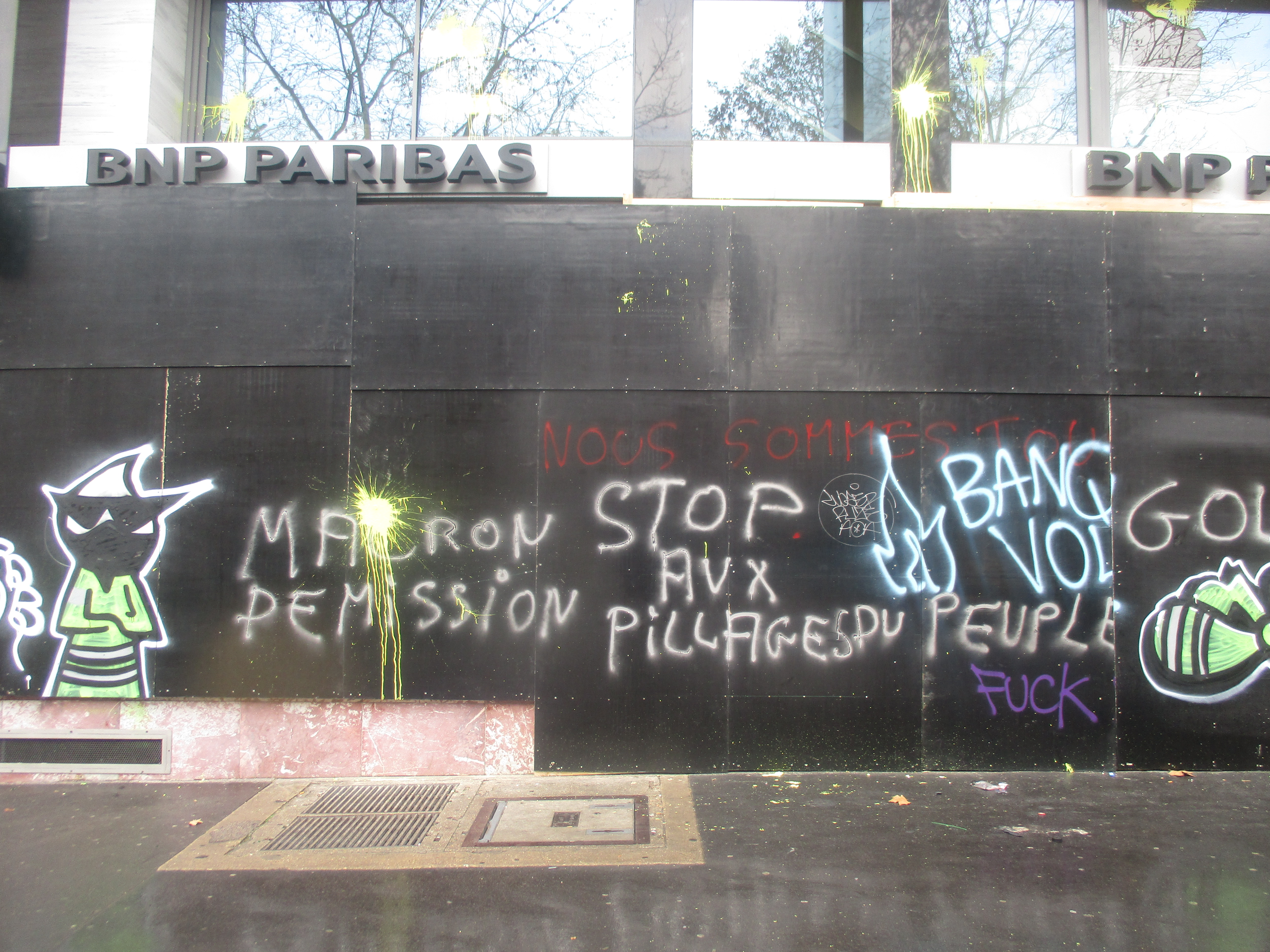 2018년 12월 1일, 파리 시위에서 차량 100대 이상이 불타고, 개선문이 파손되었다.[259] 남부 마르세유에서는 11월 5일 이후 빈번한 시위가 이어졌고, 주민 대피가 진행되었다. 경찰이 발포한 최루탄 파편에 맞은 80세 알제리 여성이 수술 도중 사망했다.[269] 아를에서 차량이 우회도로 트럭 바리케이드와 충돌하여 운전자가 사망했다.[270]