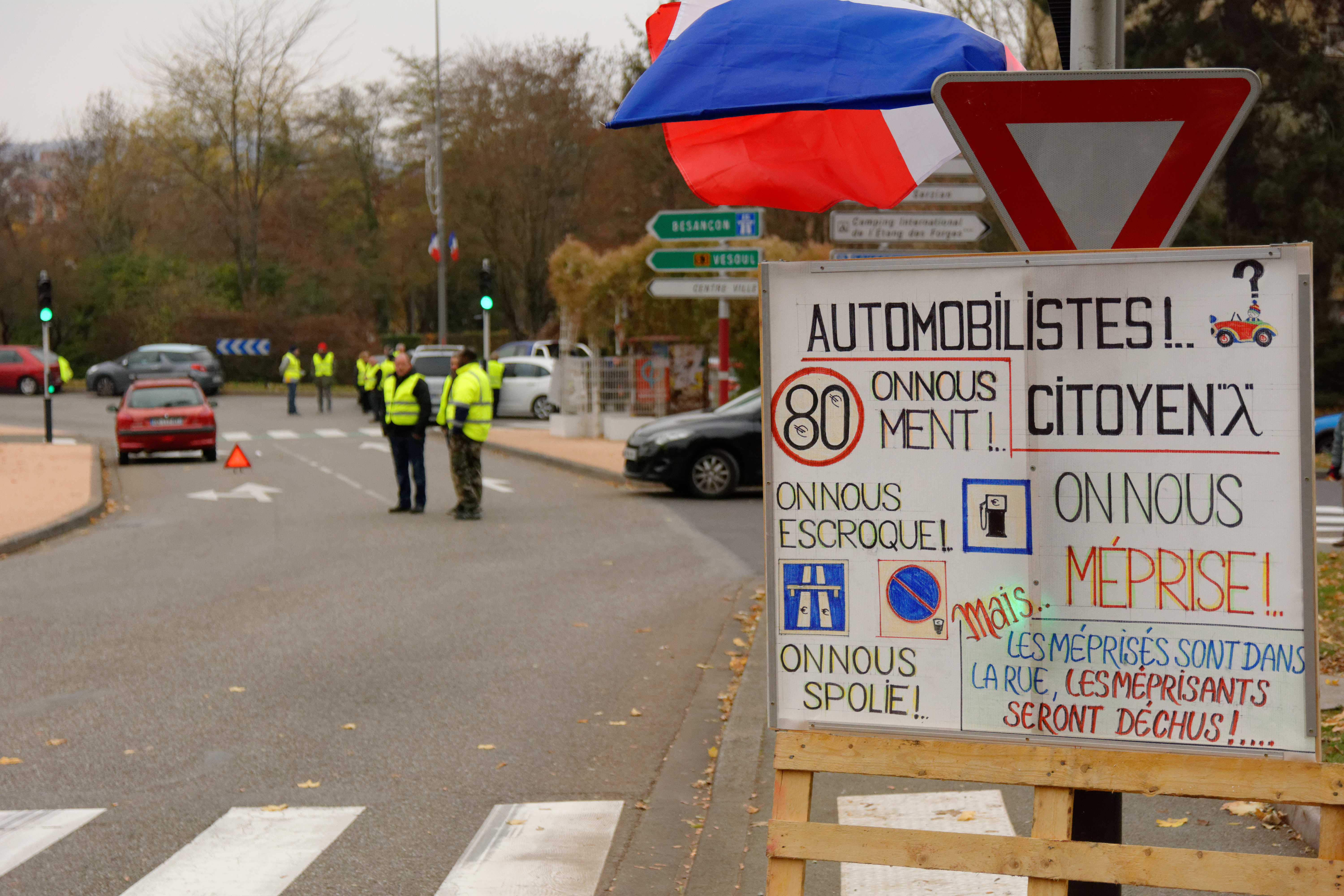 2018년 7월 1일부터 프랑스 정부는 시골 도로의 제한 속도를 90km/h에서 80km/h로 낮추는 정책을 시행했다. 이는 연간 교통사고 사망자를 200명 줄이기 위한 조치였으나, 많은 사람들에게는 또 다른 세금 부과로 여겨져 큰 반발을 샀다.[242][243][244][245] 특히 자동차에 전적으로 의존하는 시골 주민들은 이 정책이 자신들의 자동차 이용 필요성을 이해하지 못한 처사라고 비판했다. 노란 조끼 운동이 시작된 이후, 과속 단속 카메라 파손 사례가 눈에 띄게 증가했다는 사실은 이러한 반발을 잘 보여준다.[242][243][244][245]노란 조끼는 2008년부터 프랑스의 모든 운전자가 차량에 의무적으로 비치해야 하는 고시야 형광 조끼였기 때문에 시위의 상징으로 쉽게 사용될 수 있었다. 이 조끼는 흔하고 저렴하며, 어떤 옷 위에도 쉽게 착용할 수 있다는 실용적인 장점을 지녔다. 또한 노동자 계층 산업과 관련이 있고, 눈에 잘 띄며, 널리 알려진 위험 신호로 인식된다는 점에서 "통합적 요소이자 행동 촉구"로 작용했다.