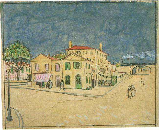 편지에는 그림 속 장소에 대한 구체적인 설명도 담겨 있다. "왼쪽 집은 녹색 덧문이 달린 노란색이다. 나무 그늘에 가려진 곳이다. 이곳은 내가 매일 식사하러 가는 식당이다. 내 친구인 관리인은 철도 다리 두 개 사이에 있는 거리 끝 왼쪽편에 있다. 내가 그린 밤의 카페는 그림에 없는데, 식당 왼쪽에 있다."