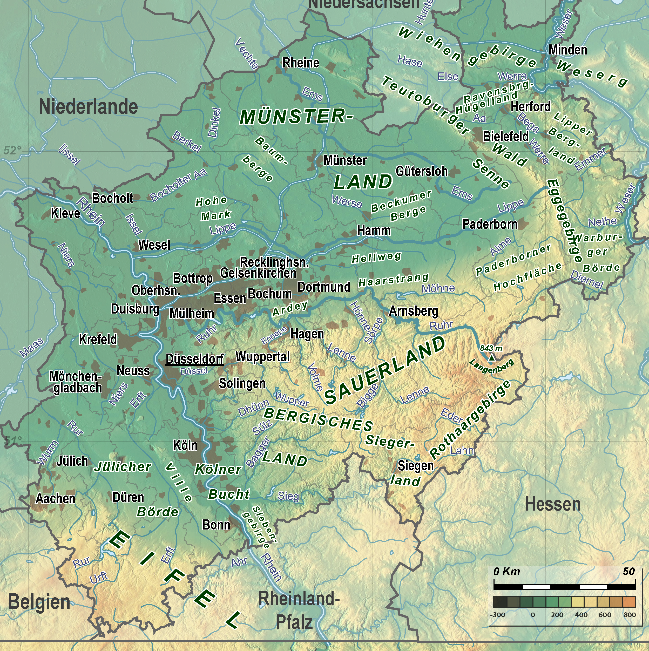 지형은 주의 남쪽과 동쪽으로 갈수록 독일의 중앙 고지대의 일부로 상승한다. 이러한 구릉 지대는 동쪽의 베저 고지대 – 에게 구릉, 비헨 구릉, 베저게비르게, 테우토부르크 숲을 포함 – , 남쪽의 자우어란트, 베르기슈란트, 지거란트, 지벤게비르게, 그리고 주의 남서쪽에 있는 좌안 라인강의 아이펠이 있다. 헤센주와의 국경 지역에 있는 로타아르게비르게는 해발 약 800m까지 상승한다. 이 산들 중 가장 높은 곳은 해발 843.2m의 Langenberg, 840.7m의 카일러 아스텐, 그리고 클레멘스베르크(839.2m)이다.