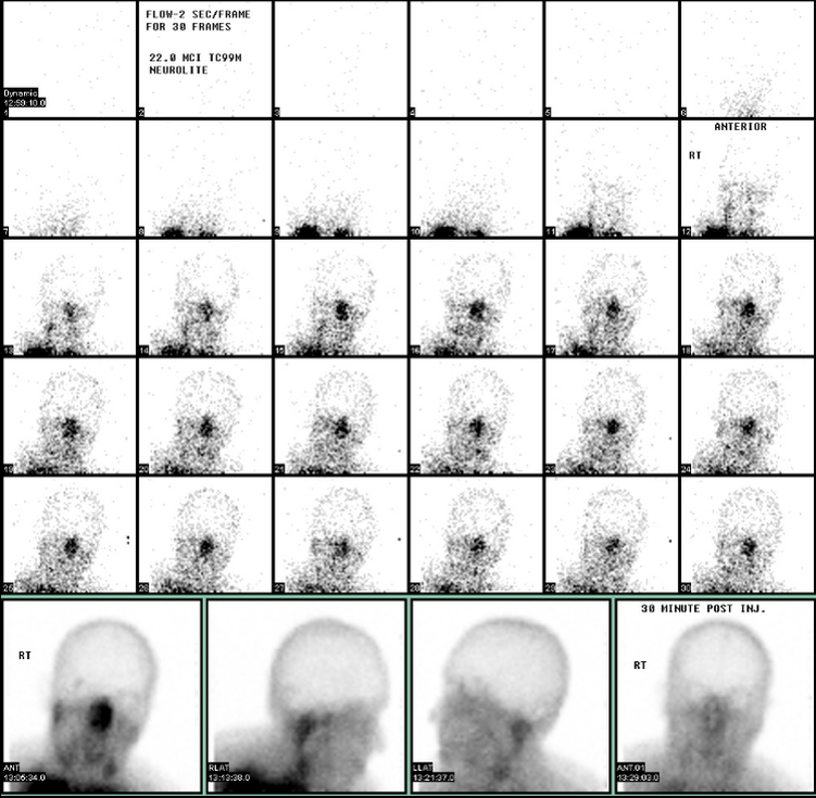 - 기타 확인 검사: 방사성 핵종 뇌 혈류 스캔은 다른 검사와 함께 고려해야 한다. 특히 처음 72시간 이내에 뇌의 일시적인 부종은 시간이 더 지나면 회복될 수 있는 환자에게서 위양성 검사 결과를 초래할 수 있다.[24] CT 혈관 조영술은 진단을 내리는 데 필요한 검사도 아니고 충분한 검사도 아니다.[25]