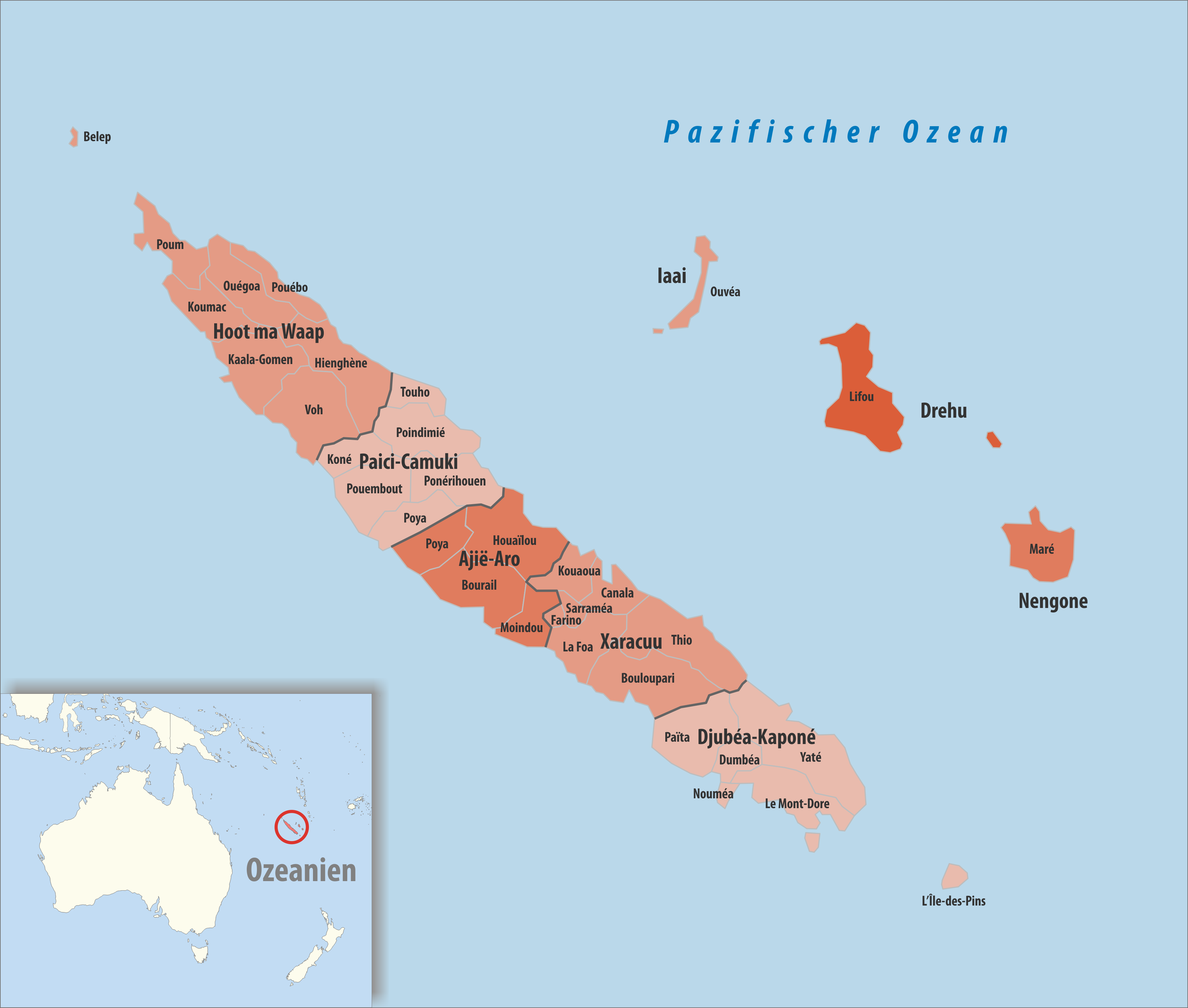 프랑스령 폴리네시아는 5개의 행정 구역과 48개의 코뮌으로 구성되어 있으며, 각 코뮌은 자체적인 행정 구역과 INSEE 코드를 가지고 행정청 소재지를 중심으로 운영된다. - 누벨칼레도니의 지리 - 누벨칼레도니의 인구