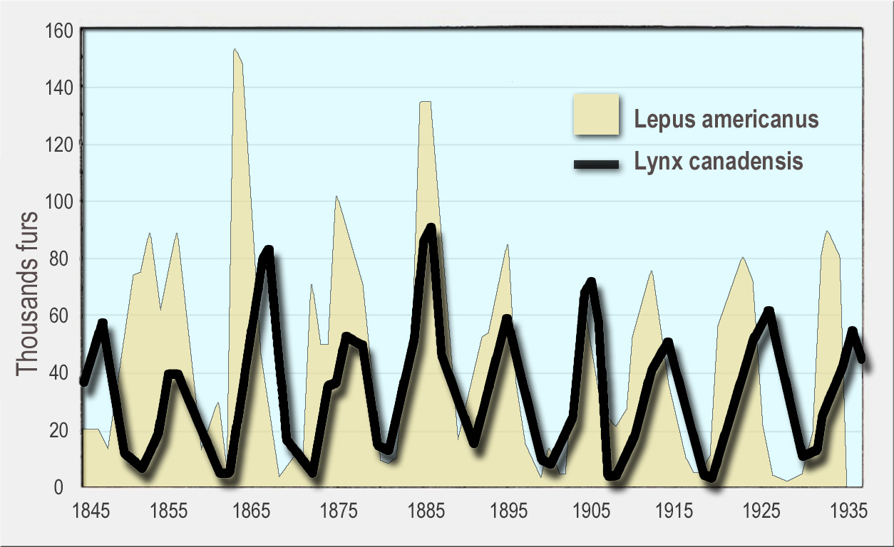 눈덧신토끼의 변동하는 개체수는 로트카-볼테라 방정식으로 모델링된다.