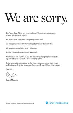 뉴스 인터내셔널은 2011년 4월 8일, ''뉴스 오브 더 월드''의 전화 해킹과 관련하여 제기된 일부 사생활 침해 소송에 대해 책임을 인정할 것이라고 발표했다. 이 회사는 8명의 원고에게 무조건적인 사과와 보상을 제공했지만, 다른 소송인들이 제기한 혐의에 대해서는 계속해서 이의를 제기할 것이라고 밝혔다.[85][86]