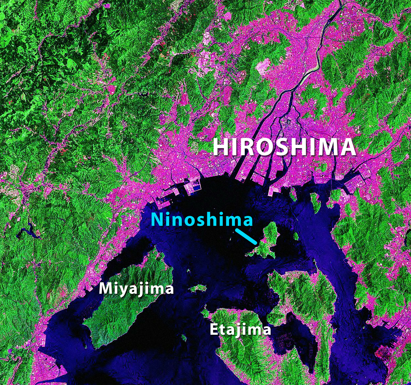 니노시마섬은 히로시마항에서 남쪽으로 약 3km 거리에 위치한 섬으로, 아키코후지 산(해발 278m)이 있으며, 1929년 히로시마시에 편입되었다. 과거에는 군사 시설이 있었고, 특히 제2차 세계 대전 중에는 검역소로 사용되어 원폭 투하 후 피폭자들이 이송되기도 했다. 현재는 낚시, 갯벌 체험, 귤 따기 등 관광 활동이 이루어지며, 니노시마 기선과 벙커 서플라이가 히로시마항과 섬을 연결하는 정기 항로를 운항한다.