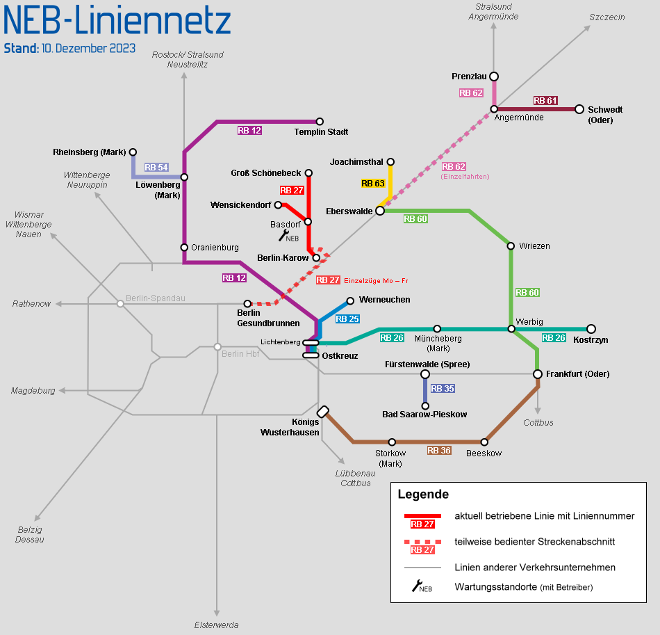 NEB는 동부 브란덴부르크 지역의 여러 노선(Netz Ostbrandenburg)과 하이데크라우트선(Heidekrautbahn)의 운영권을 가지고 있다. 현재 "Netz Ostbrandenburg 2" 계약(RB12, RB25, RB26, RB35, RB36, RB54, RB60, RB61, RB62, RB63 노선 포함)과 "Heidekrautbahn" 계약(RB27 노선) 모두 2024년 12월부터 2034년 12월까지 유효하다.[5][6][7][8]