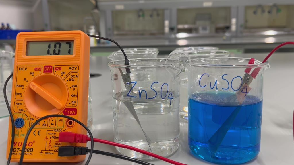 이 과정에서 음극에는 고체 구리가 쌓이고, 아연 전극은 아연 양이온으로 녹아 용액에 들어간다.
